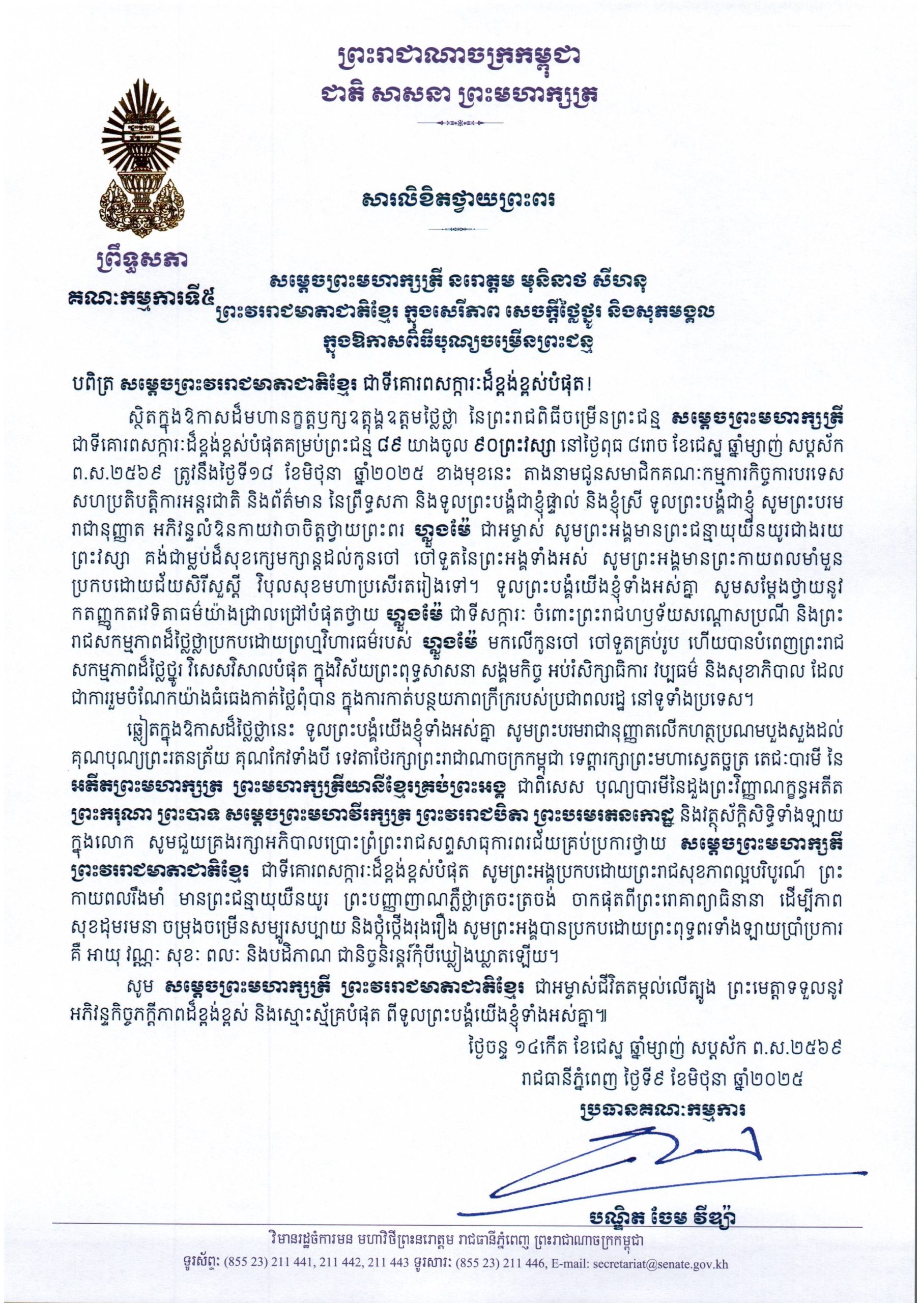 លិខិតថ្លែងអំណរគុណរបស់ឯកឧត្តមបណ្ឌិត ចែម វីឌ្យ៉ា ប្រធានគណៈកម្មការទី៥ព្រឹទ្ធសភា ជូន ឯកឧត្តម សាយ សំអាល់ ឧបនាយករដ្ឋមន្ត្រី រដ្ឋមន្ត្រីក្រសួងរៀបចំដែនដី នគរូបនីយកម្ម និងសំណង់ ដែលឯកឧត្តម ឧបនាយករដ្ឋមន្ត្រី បានជូនឯកឧត្តមបណ្ឌិត ប្រធានគណៈកម្មការទី៥ព្រឹទ្ធសភា នូវសារលិខិតជូនពរ ក្នុងឱកាសឆ្នាំថ្មី ឆ្នាំសកល២០២៦