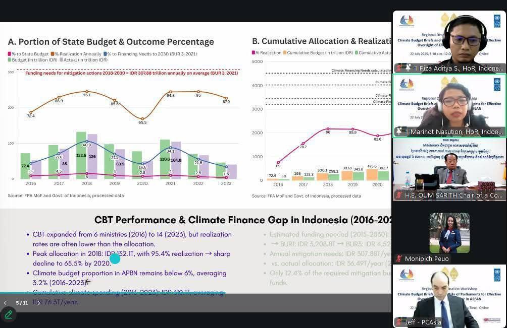 នាព្រឹកថ្ងៃទី២២ ខែកក្កដា ឆ្នាំ២០២៥ វេលាម៉ោង ០៨:៣០នាទីព្រឹក ឯកឧត្តម យស ផានីត្តា ប្រធានគណៈកម្មការទី២ព្រឹទ្ធសភា ឯកឧត្ដមបណ្ឌិត នាង ផាត ប្រធានគណៈកម្មការទី៤ព្រឹទ្ធសភា លោកជំទាវបណ្ឌិត ចាន់ សុទ្ធាវី ប្រធានគណៈកម្មការទី៦ព្រឹទ្ធសភា ឯកឧត្តម អ៊ុ សារឹទ្ធ ប្រធានគណៈកម្មការទី៩ព្រឹទ្ធសភា ឯកឧត្តម ង៉ាន់ ចំរើន អនុប្រធានគណៈកម្មការទី៥ព្រឹទ្ធសភា ឯកឧត្តម លេង វី លេខាធិការគណៈកម្មការទី៣ព្រឹទ្ធសភា ឯកឧត្ដមសន្ដិបណ្ឌិត តេង សាវង្ស លេខាធិការគណៈកម្មការទី៤ព្រឹទ្ធសភា ឯកឧត្តម គង់ ម៉ូនីកា សមាជិកគណៈកម្មការទី១ព្រឹទ្ធសភា ព្រះអង្គម្ចាស់ ស៊ីសុវត្ថិ ធម្មិកោ សមាជិកគណៈកម្មការទី៣ព្រឹទ្ធសភា និងឯកឧត្តម ហេង ហាលីម សមាជិកគណៈកម្មការទី៨ព្រឹទ្ធសភា បានអញ្ជើញចូលរួមក្នុងសិក្ខាសាលាផ្សព្វផ្សាយថ្នាក់តំបន់ស្ដីពី “ការបង្ហាញពីលទ្ធផលនៃការសិក្សាស្រាវជ្រាវពីថវិកាអាកាសធាតុ និងប្រសិទ្ធភាពនៃ តួនាទីរបស់សភាក្នុងការតាមដាន និងត្រួតពិនិត្យហិរញ្ញវត្ថុអាកាសធាតុ នៅអាស៊ាន” តាមប្រព័ន្ធនិម្មិត ZOOM ។