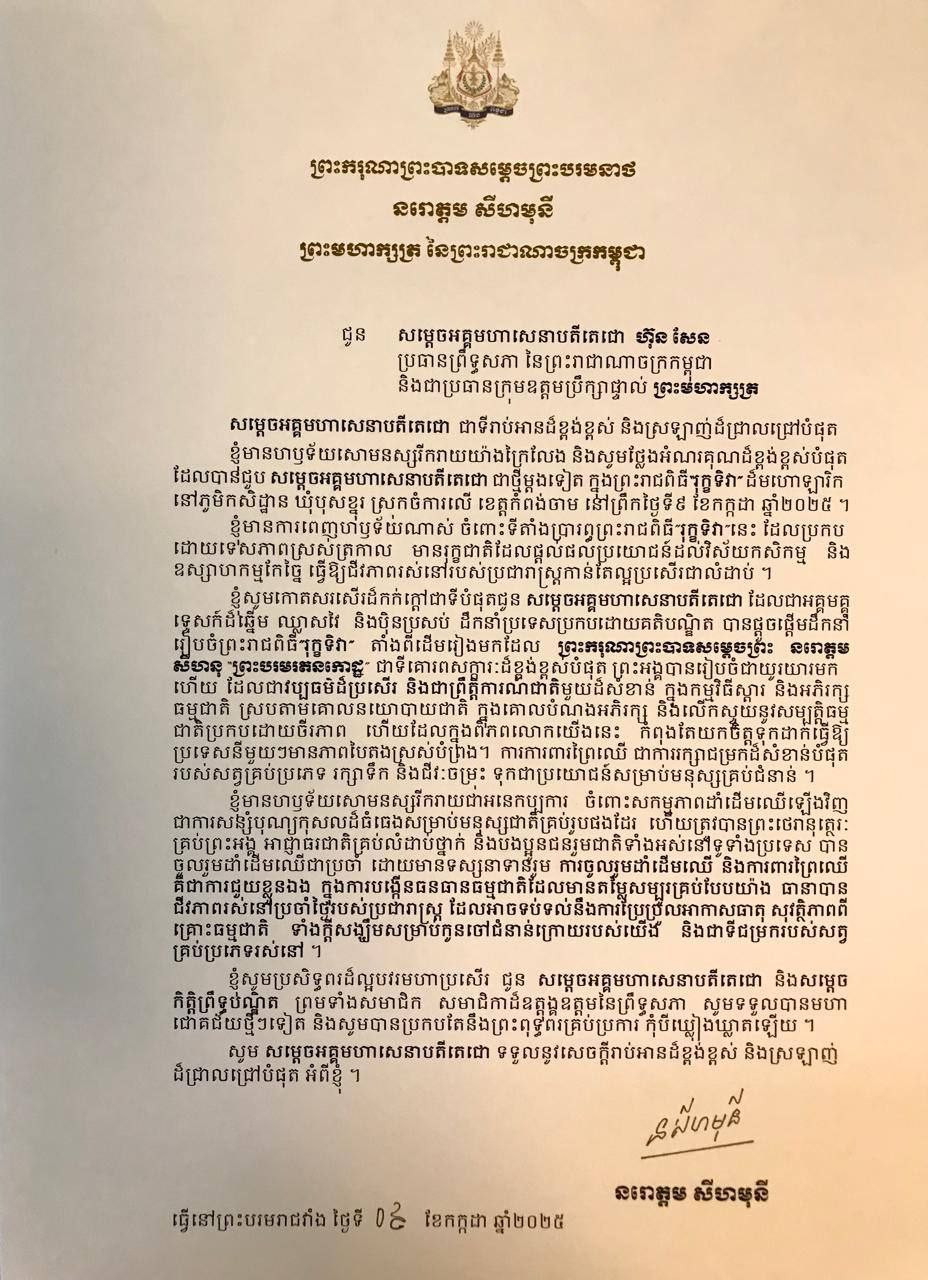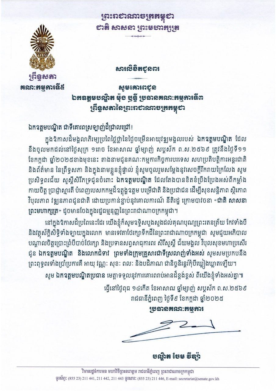 លិខិតថ្លែងអំណរគុណរបស់ឯកឧត្តមបណ្ឌិត ចែម វីឌ្យ៉ា ប្រធានគណៈកម្មការទី៥ព្រឹទ្ធសភា ជូន ឯកឧត្តម សាយ សំអាល់ ឧបនាយករដ្ឋមន្ត្រី រដ្ឋមន្ត្រីក្រសួងរៀបចំដែនដី នគរូបនីយកម្ម និងសំណង់ ដែលឯកឧត្តម ឧបនាយករដ្ឋមន្ត្រី បានជូនឯកឧត្តមបណ្ឌិត ប្រធានគណៈកម្មការទី៥ព្រឹទ្ធសភា នូវសារលិខិតជូនពរ ក្នុងឱកាសឆ្នាំថ្មី ឆ្នាំសកល២០២៦