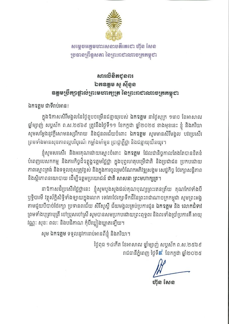 លិខិតរំលែកមរណទុក្ខរបស់លោកជំទាវ មាន សំអាន ប្រធានក្រុមសមាជិកាព្រឹទ្ធសភា ជូនចំពោះ ក្រុមគ្រួសារនៃសព អនុសេនីយ៍ត្រី ហែន ភីណា ដែល លោកអនុសេនីយ៍ត្រី បានពលីជីវិតក្នុងបុព្វហេតុជាតិ និងការពារបូរណភាពទឹកដីនៅសមរភូមិមុខ ខេត្តព្រះវិហារ កាលពីយប់ថ្ងៃចន្ទ ទី៨ ខែធ្នូ ឆ្នាំ២០២៥