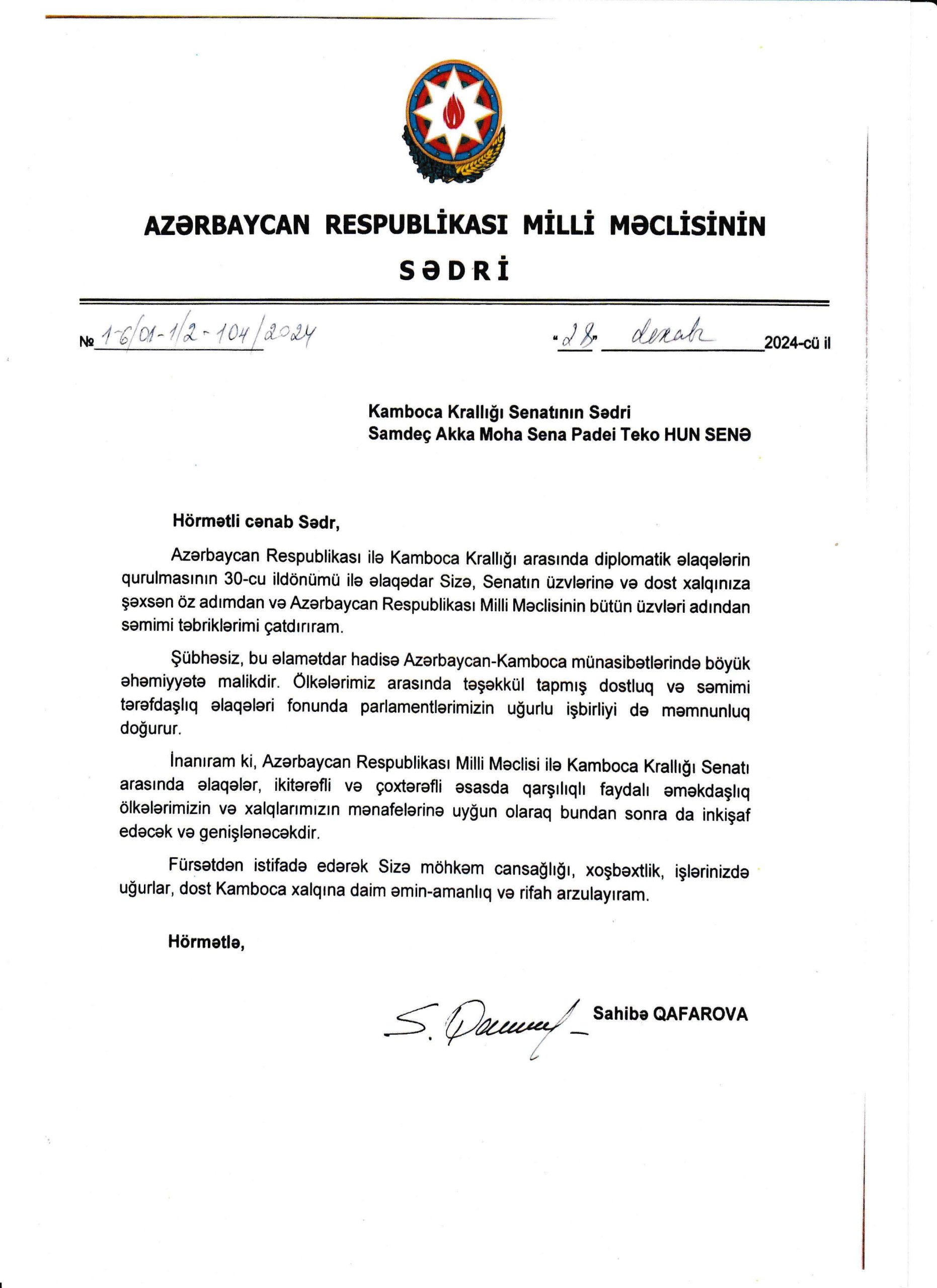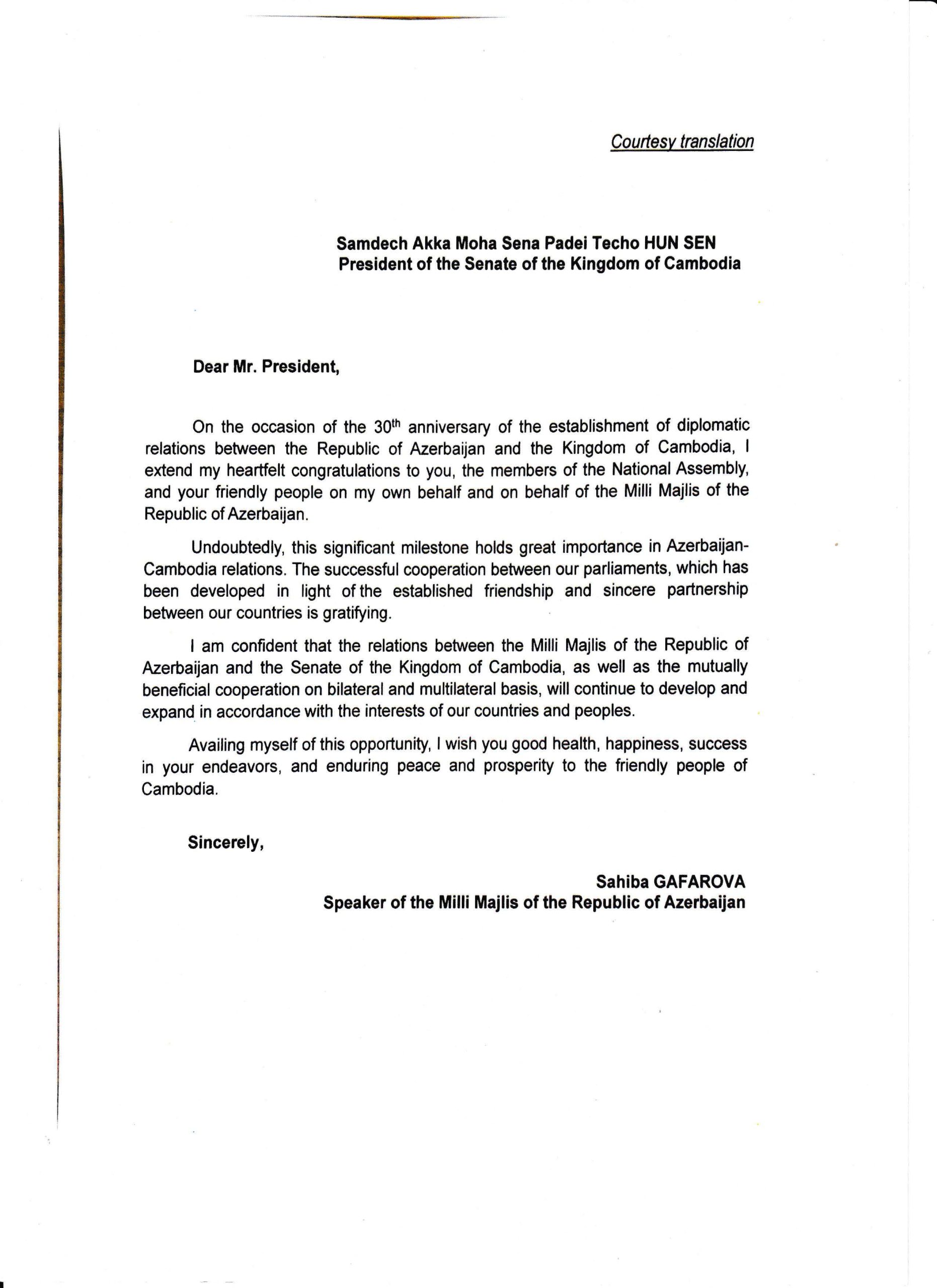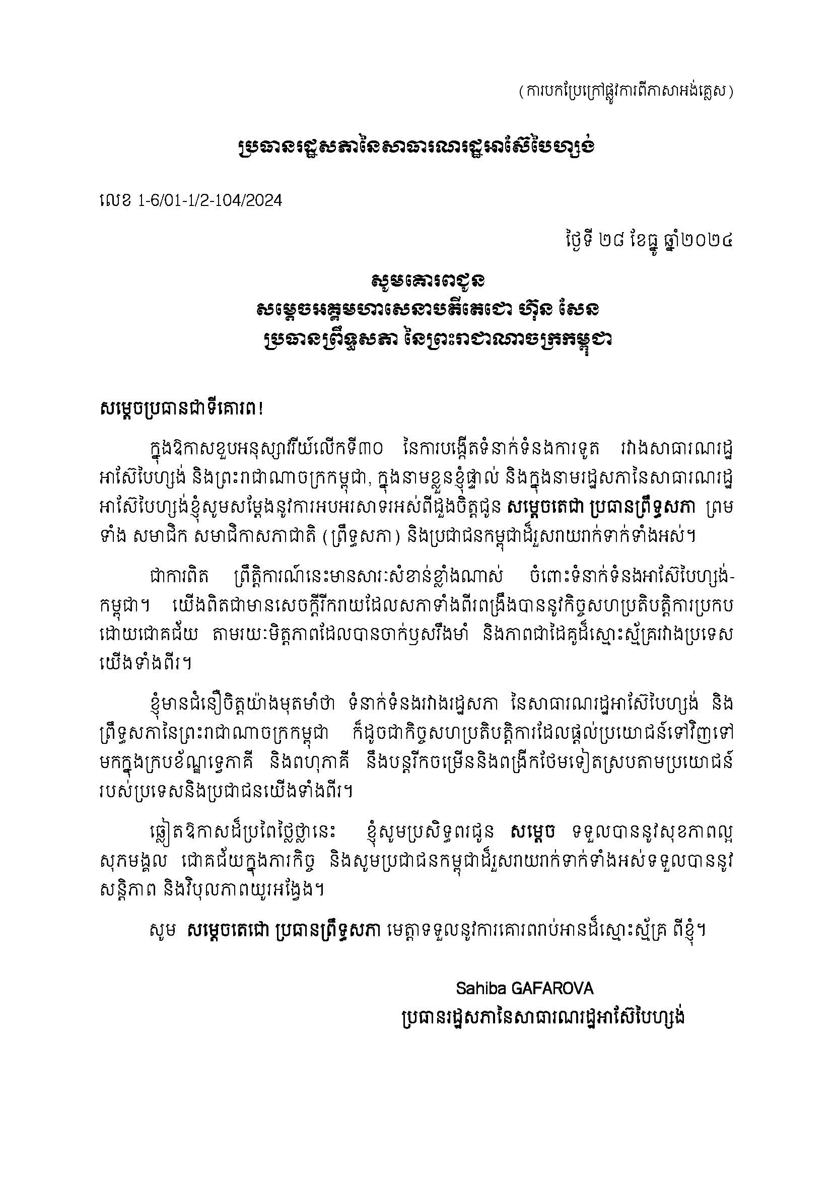 សារលិខិតអបអរសាទររបស់ លោកជំទាវ Sahiba GAFAROVA ប្រធានរដ្ឋសភានៃសាធារណរដ្ឋអាស៊ែបៃហ្សង់ ជូនចំពោះ សម្តេចតេជោ ក្នុងឱកាសខួបអនុស្សាវរីយ៍លើកទី៣០ នៃការបង្កើតទំនាក់ទំនងការទូត រវាងសាធារណរដ្ឋអាស៊ែបៃហ្សង់ និងព្រះរាជាណាចក្រកម្ពុជា។ សម្តេចបានផ្ញើលិខិតអបអរសាទរខួបអនុស្សាវរីយ៍លើកទី៣០ នេះ ជូន លោកជំទាវ Sahiba GAFAROVA កាលពីថ្ងៃទី១១ ខែធ្នូ ឆ្នាំ២០២៤ កន្លងទៅនេះ