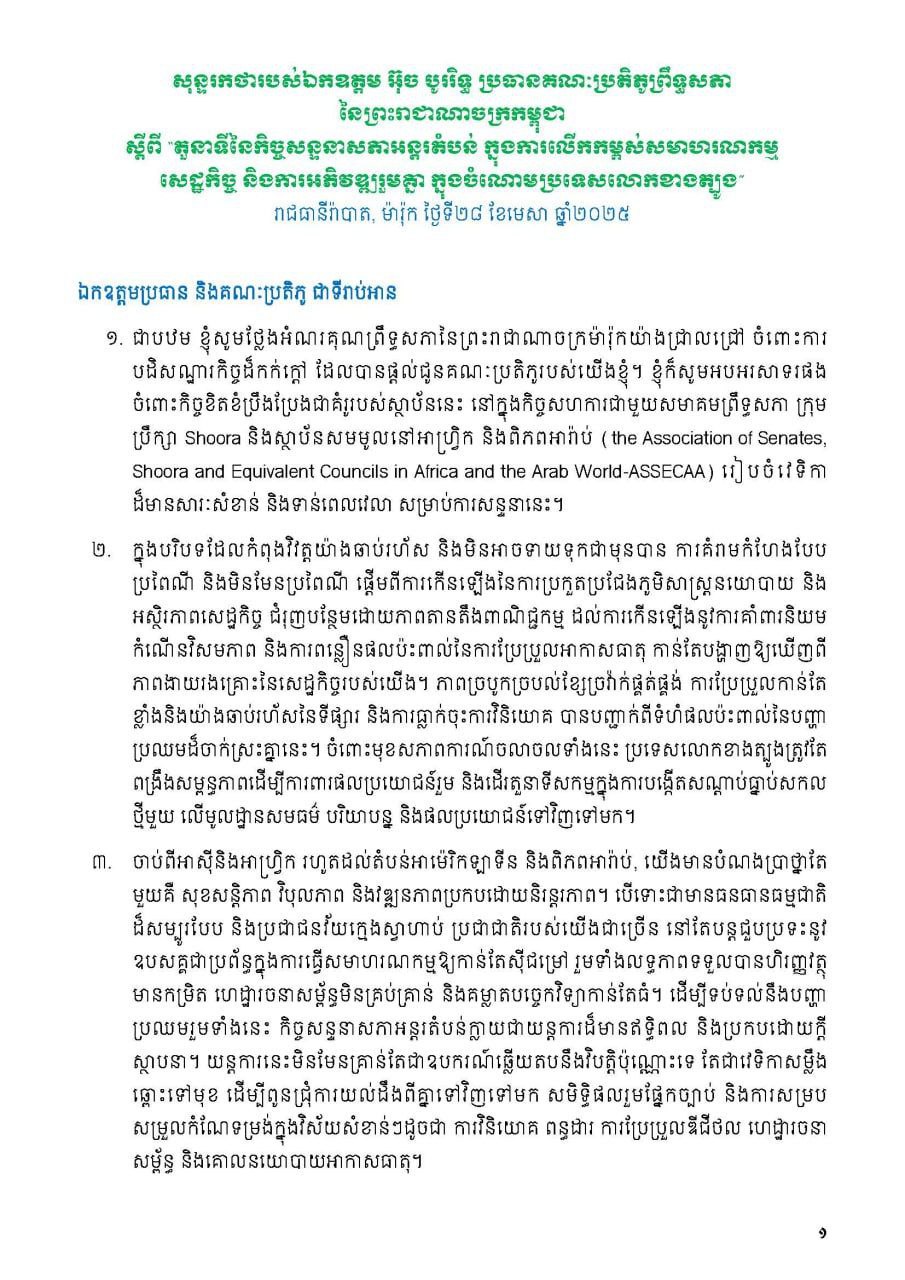 នៅព្រឹកថ្ងៃចន្ទ ទី២៨ ខែមេសា ឆ្នាំ២០២៥ ឯកឧត្តម អ៊ុច បូររិទ្ធ អនុប្រធានទី១ ព្រឹទ្ធសភា បានដឹកនាំគណៈប្រតិភូកម្ពុជាអញ្ជើញចូលរួម វេទិកាលើកទី៣ នៃកិច្ចសន្ទនាសភាត្បូង-ត្បូង (The Third Edition of the South-South Parliamentary Dialogue Forum) នៅរាជធានីរ៉ាបាត ព្រះរាជាណាចក្រម៉ារ៉ុក។