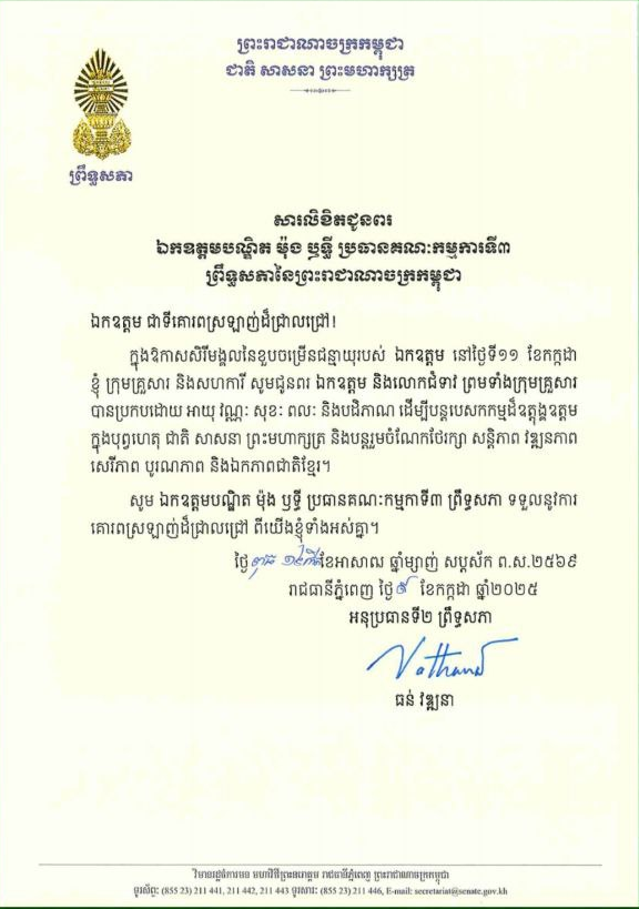 សារលិខិតជូនពររបស់ឯកឧត្តម​ ឡាយ សំកុល​ អគ្គលេខាធិការ​ព្រឹទ្ធសភា​ គោរពជូន សម្តេចកិត្តិព្រឹទ្ធបណ្ឌិត ប៊ុន រ៉ានី ហ៊ុន សែន ប្រធានកាកបាទក្រហមកម្ពុជា ក្នុងឱកាសដ៏ឧត្តុង្គឧត្តមប្រកបដោយក្តីសោមនស្សរីករាយ នៃពិធីចម្រើនជន្មាយុរបស់ សម្តេចកិត្តិព្រឹទ្ធបណ្ឌិត ដែលនឹងប្រព្រឹត្តទៅនៅថ្ងៃទី១៥ ខែធ្នូ ឆ្នាំ២០២៥ ខាងមុខនេះ