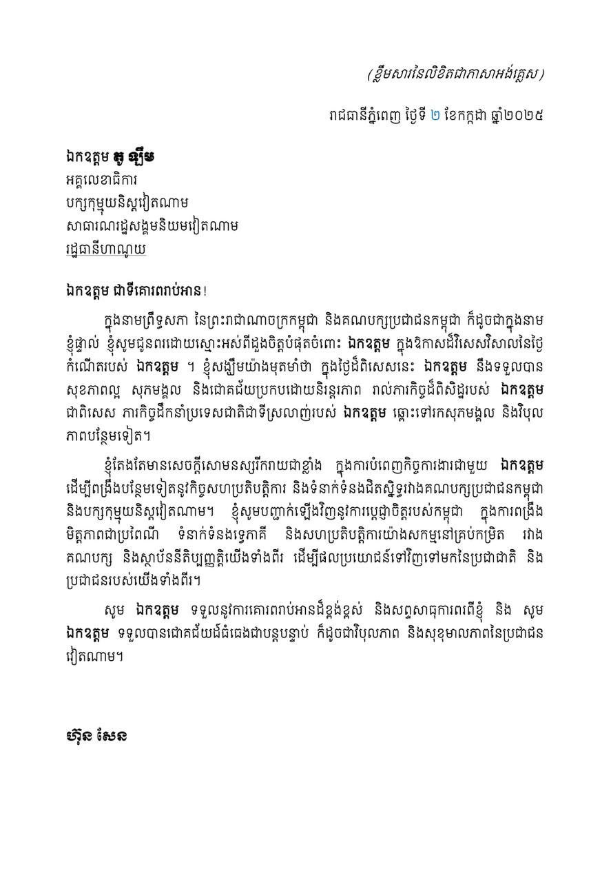សារលិខិតជូនពររបស់ សម្តេចអគ្គមហាសេនាបតីតេជោ ហ៊ុន សែន ប្រធានព្រឹទ្ធសភានៃព្រះរាជាណាចក្រកម្ពុជា ផ្ញើជូន ឯកឧត្តម តូ ឡឹម អគ្គលេខាធិការបក្សកុម្មុយនិស្តវៀតណាម នាឱកាសនៃថ្ងៃខួបកំណើតរបស់ឯកឧត្តម នៅថ្ងៃទី១០ ខែកក្កដា ខាងមុខនេះ