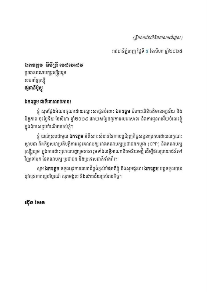 លិខិតថ្លែងអំណរគុណរបស់ សម្តេចអគ្គមហាសេនាបតីតេជោ ហ៊ុន សែន ប្រធានព្រឹទ្ធសភា នៃព្រះរាជាណាចក្រកម្ពុជា ជូនឯកឧត្តម ឌីមីទ្រី មេដវេដេវ ប្រធានគណបក្សរុស្ស៊ីរួបរួម ដែលឯកឧត្តមបានជូនលិខិតជូនពរ ក្នុងឱកាសនៃពិធីចម្រើនជន្មាយុរបស់សម្តេចតេជោ