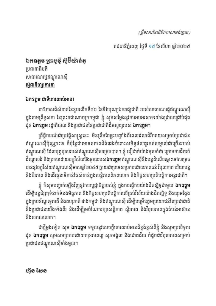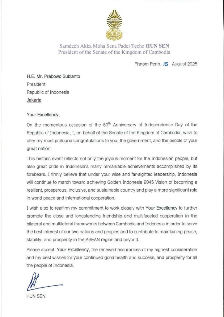 សារលិខិតអបអរសាទររបស់សម្តេចអគ្គមហាសេនាបតីតេជោ ហ៊ុន សែន ប្រធានព្រឹទ្ធសភា នៃព្រះរាជាណាចក្រកម្ពុជា ជូនឯកឧត្តម ប្រាបូវ៉ូ ស៊ូប៊ីយ៉ាន់តូ ប្រធានាធិបតីសាធារណរដ្ឋឥណ្ឌូណេស៊ី នាឱកាសដ៏សំខាន់នៃខួបលើកទី៨០ នៃទិវាបុណ្យឯករាជ្យជាតិ របស់សាធារណរដ្ឋឥណ្ឌូណេស៊ី
