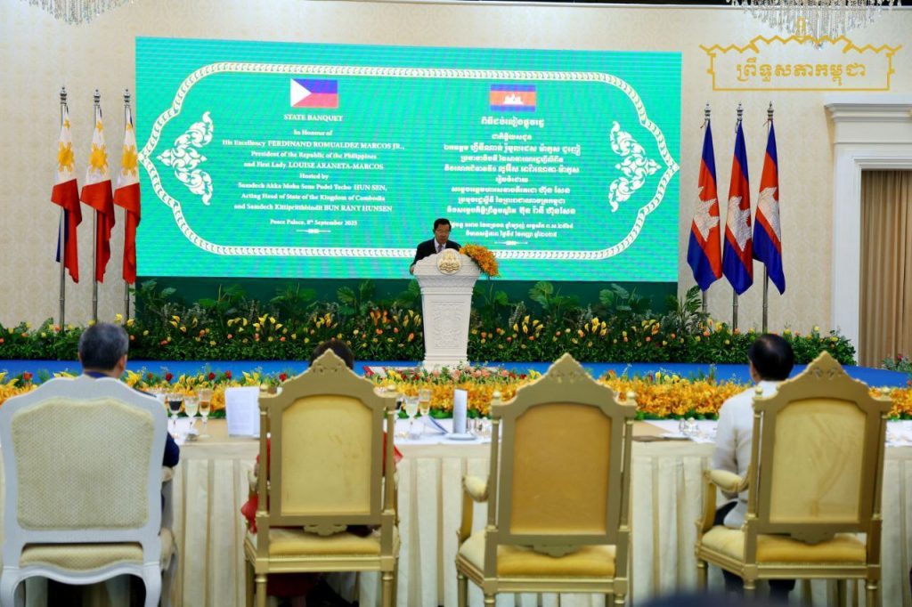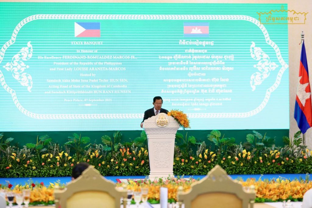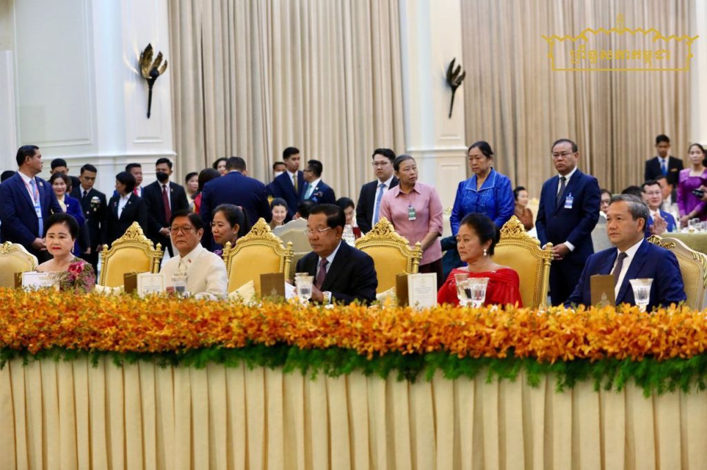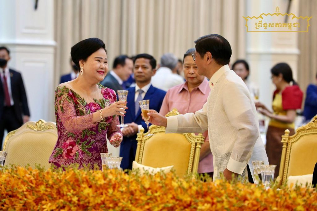 នាយប់ថ្ងៃទី៨ ខែសីហា ឆ្នាំ២០២៥ សម្តេចអគ្គមហាសេនាបតីតេជោ ហ៊ុន សែន ប្រមុខរដ្ឋស្ដីទី នៃព្រះរាជាណាចក្រកម្ពុជា និងសម្តេចកិត្តិព្រឹទ្ធបណ្ឌិត ប៊ុន រ៉ានី ហ៊ុនសែន បានអញ្ជើញរៀបចំពិធីជប់លៀងផ្លូវរដ្ឋ ជូនឯកឧត្តម Ferdinand Romualdez Marcos Jr. (ហ្វឺឌីណាន់ រ៉ូម៉ូលដេស ម៉ាកូស ជូញៀ) ប្រធានាធិបតី នៃសាធារណរដ្ឋហ្វីលីពីន និងលោកជំទាវ Louise Araneta-Marcos (លូអ៊ីស អារ៉ាណេតា ម៉ាកូស) នៅវិមានសន្តិភាព…។