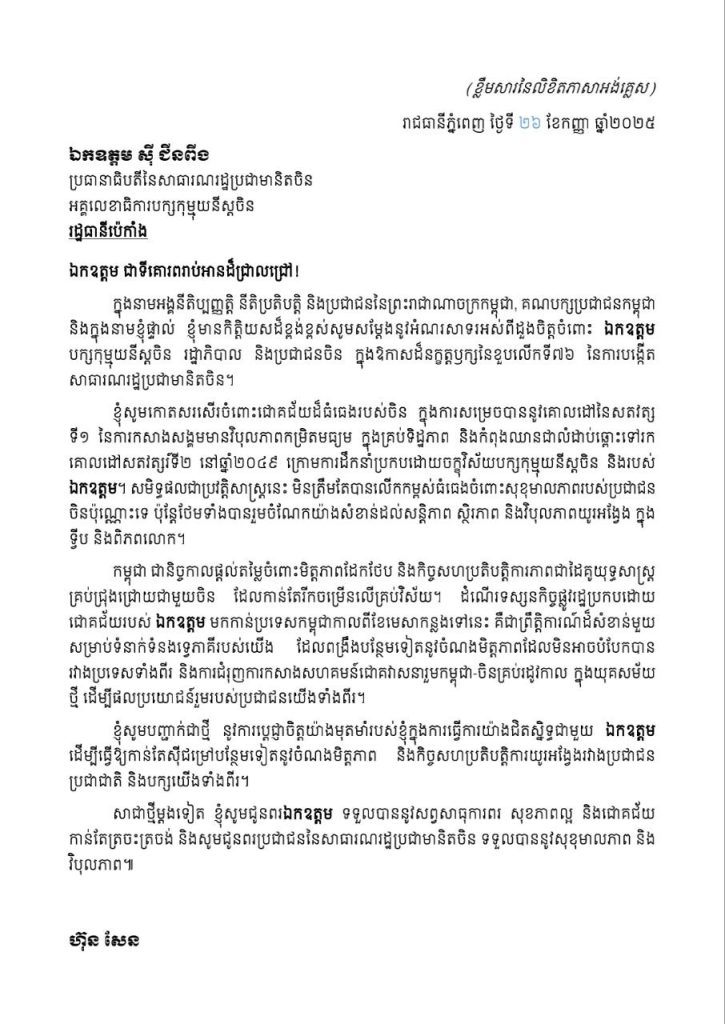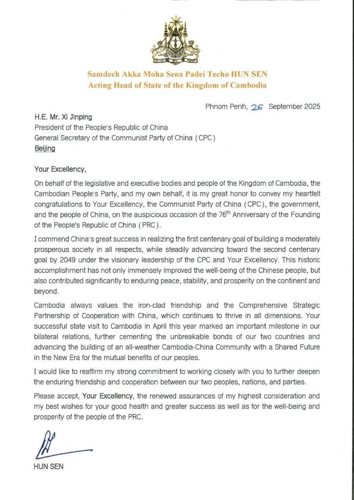 លិខិតអបអរសាទររបស់សម្តេចអគ្គមហាសេនាបតីតេជោ ហ៊ុន សែន ប្រមុខរដ្ឋស្តីទី នៃព្រះរាជាណាចក្រកម្ពុជា ជូន ឯកឧត្តម ស៊ី ជីនពីង ប្រធានាធិបតីនៃសាធារណរដ្ឋប្រជាមានិតចិន ក្នុងឱកាសដ៏នក្ខត្តឫក្សនៃខួបលើកទី៧៦ នៃការបង្កើត សាធារណរដ្ឋប្រជាមានិតចិន
