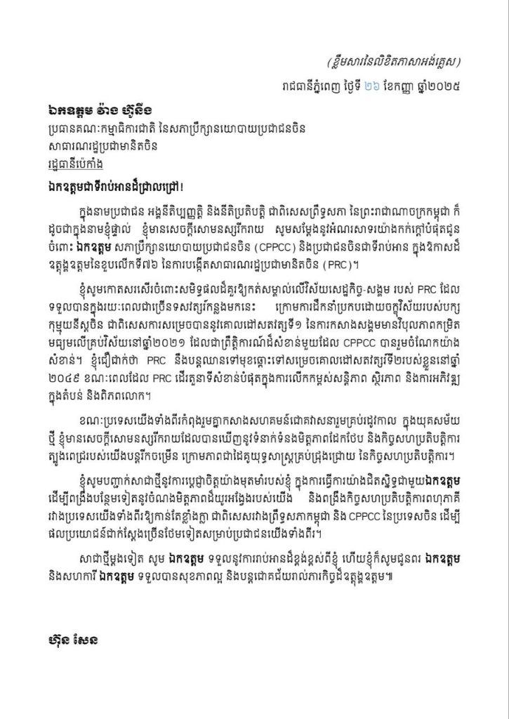 • លិខិតអបអរសាទររបស់សម្តេចអគ្គមហាសេនាបតីតេជោ ហ៊ុន សែន ប្រមុខរដ្ឋស្តីទី នៃព្រះរាជាណាចក្រកម្ពុជា  ជូន ឯកឧត្តម វ៉ាង ហ៊ូនឹង ប្រធានគណៈកម្មាធិការជាតិ នៃសភាប្រឹក្សានយោបាយប្រជាជនចិន ក្នុងឱកាសដ៏ ឧត្តុង្គឧត្តមនៃខួបលើកទី៧៦ នៃការបង្កើតសាធារណរដ្ឋប្រជាមានិតចិន (PRC)។
