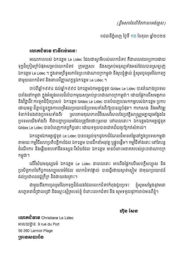 សម្តេចអគ្គមហាសេនាបតីតេជោ ហ៊ុន សែន ប្រធានព្រឹទ្ធសភានៃព្រះរាជាណាចក្រកម្ពុជា ផ្ញើសារលិខិតរំលែកទុក្ខជូន លោកជំទាវ Christiane Le Lidec ចំពោះមរណភាព ឯកឧត្តម Le Lidec អតីតឯកអគ្គរដ្ឋទូតនៃសាធារណរដ្ឋបារាំងប្រចាំកម្ពុជាពីឆ្នាំ១៩៩៤ ដល់ឆ្នាំ១៩៩៨