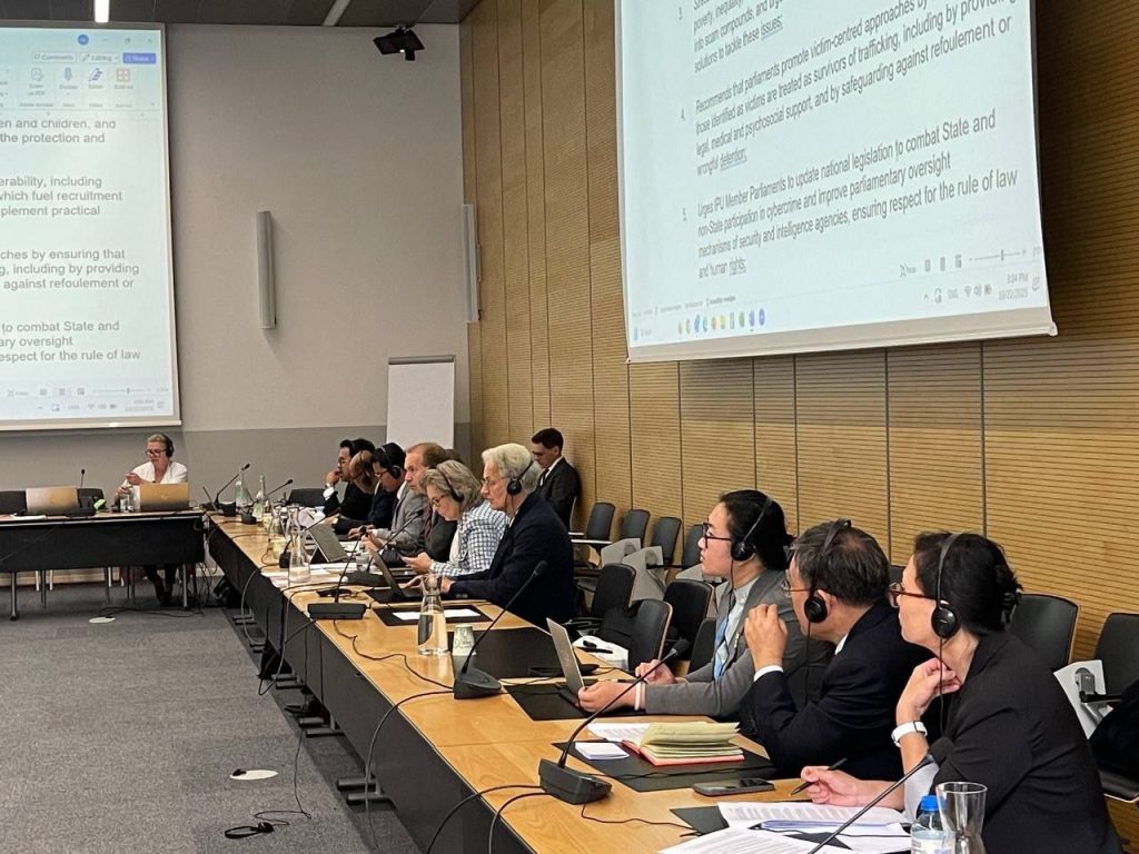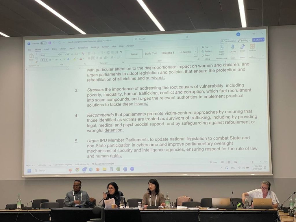 នារសៀលថ្ងៃពុធ ទី២២ ខែតុលា ឆ្នាំ២០២៥ ឯកឧត្តម ងី ច័ន្ទ្រផល ប្រធានគណៈកម្មការសិទ្ធិមនុស្ស ទទួលពាក្យបណ្តឹង និងអង្កេតនៃព្រឹទ្ធសភា(គណៈកម្មការទី១) ដែលត្រូវបានក្រុមតំណាងភូមិសាស្ត្រនយោបាយអាស៊ី-ប៉ាស៊ីហ្វីជ្រើសតាំងជាតំណាង បានអញ្ជើញចូលរួមកិច្ចប្រជុំគណៈកម្មាធិការតាក់តែងសេចក្ដីព្រាងសេចក្ដីសម្រេច ដោយបានពិនិត្យនិងផ្ដល់យោបល់រួមជាមួយក្រុមតំណាងភូមិសាស្ត្រនយោបាយដទៃទៀត លើសេចក្ដីព្រាងសេចក្ដីសម្រេចស្ដីពី “សកម្មភាពសមាជិកសភាប្រឆាំងនឹងឧក្រិដ្ឋកម្មឆ្លងដែនដែលមានអង្គការចាត់តាំង, ឧក្រិដ្ឋកម្មតាមប្រព័ន្ធអ៊ីនធឺណិត និងការគំរាមកំហែងចម្រុះដល់លទ្ធិប្រជាធិបតេយ្យ និងសន្តិសុខមនុស្ស” មុននឹងដាក់ជូនមហាសន្និបាតលើកទី១៥១ នៃសហភាពអន្តរសភាសម្រេច។