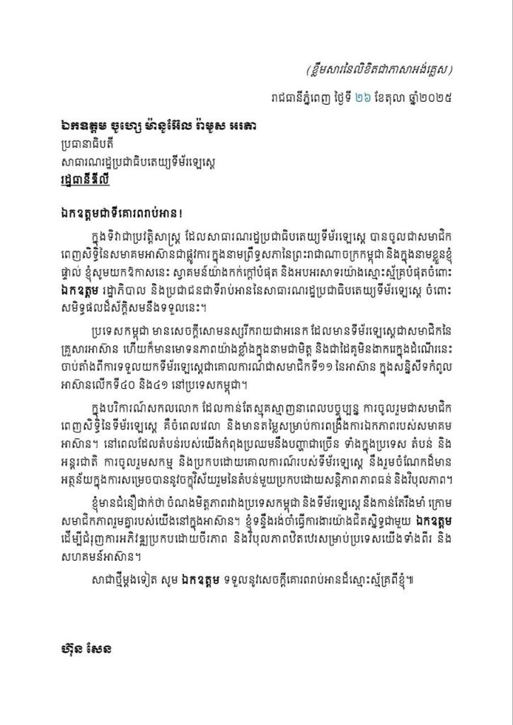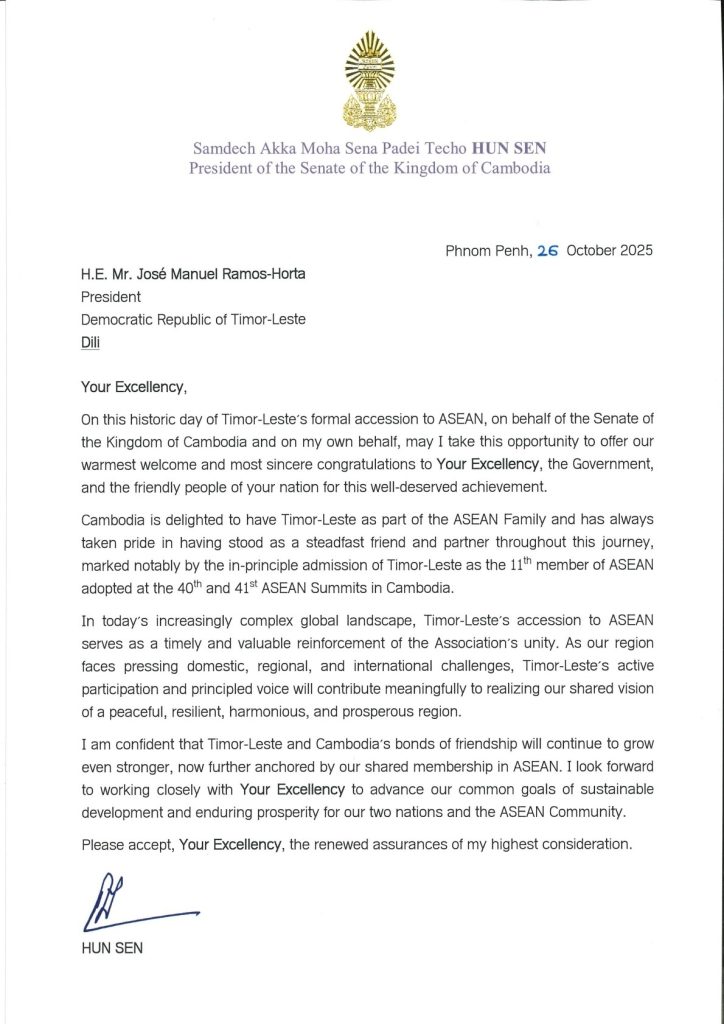 សារលិខិតអបអរសាទររបស់សម្តេចអគ្គមហាសេនាបតីតេជោ ហ៊ុន សែន ប្រធានព្រឹទ្ធសភា នៃព្រះរាជាណាចក្រកម្ពុជា ជូន ឯកឧត្តម ចូហ្សេ ម៉ានូអ៊ែល រ៉ាមូស អរតា ប្រធានាធិបតីសាធារណរដ្ឋប្រជាធិបតេយ្យទីម័រឡេស្តេ ក្នុងទិវាជាប្រវត្តិសាស្ត្រ ដែលសាធារណរដ្ឋប្រជាធិបតេយ្យទីម័រឡេស្តេ បានចូលជាសមាជិក ពេញសិទ្ធិនៃសមាគមអាស៊ានជាផ្លូវការ