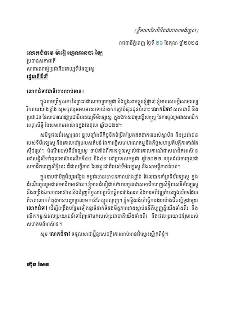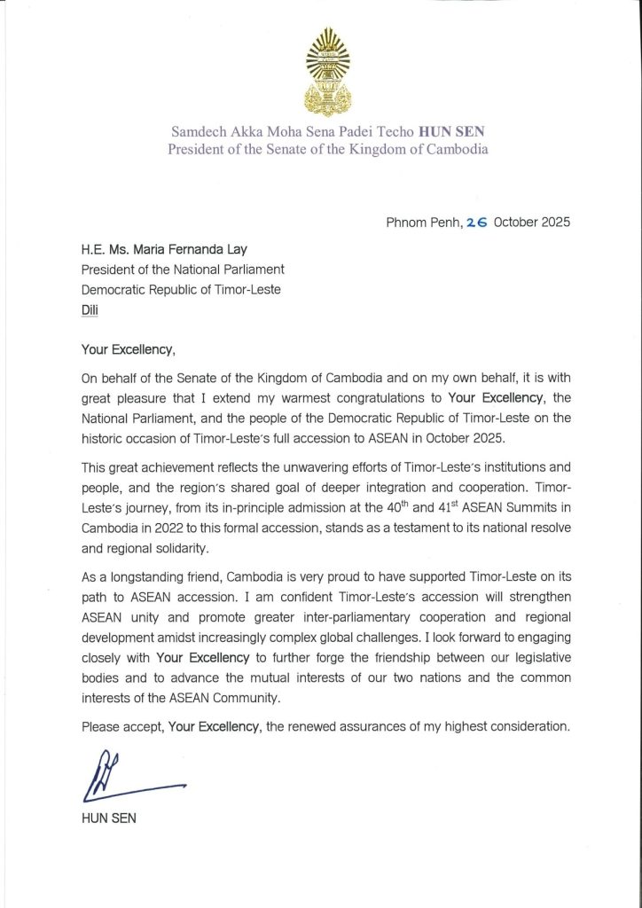 សារលិខិតអបអរសាទររបស់សម្តេចអគ្គមហាសេនាបតីតេជោ ហ៊ុន សែន ប្រធានព្រឹទ្ធសភា នៃព្រះរាជាណាចក្រកម្ពុជា ជូន លោកជំទាវ ម៉ារៀ ហ្វេណានដា ឡៃ ប្រធានសភាជាតិ នៃសាធារណរដ្ឋប្រជាធិបតេយ្យទីម័រឡេស្តេ ក្នុងឱកាសជាប្រវត្តិសាស្ត្រ នៃការចូលរួមជាសមាជិក ពេញសិទ្ធិ នៃសមាគមអាស៊ានក្នុងខែតុលា ឆ្នាំ២០២៥