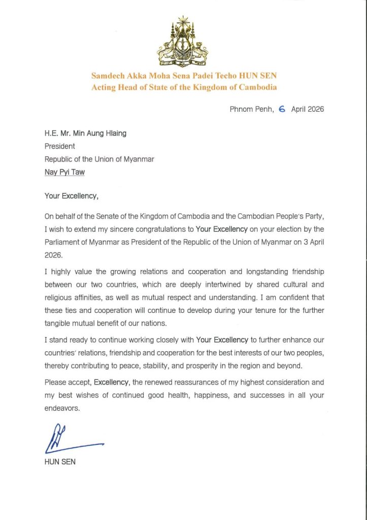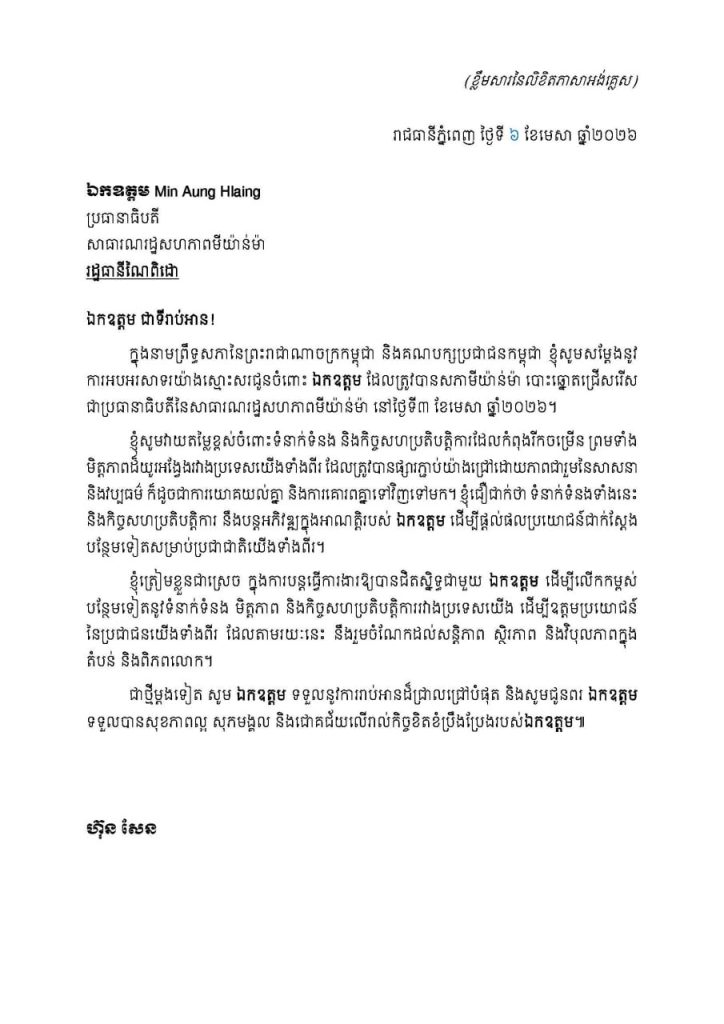 • សារលិខិតអបអរសាទររបស់សម្តេចអគ្គមហាសេនាបតីតេជោ ហ៊ុន សែន ប្រមុខរដ្ឋស្តីទី នៃព្រះរាជាណាចក្រកម្ពុជា ជូន ឯកឧត្តម Min Aung Hlaing ដែលឯកឧត្តមត្រូវបានសភាមីយ៉ាន់ម៉ា បោះឆ្នោតជ្រើសរើសជា «ប្រធានាធិបតីនៃសាធារណរដ្ឋសហភាពមីយ៉ាន់ម៉ា»។