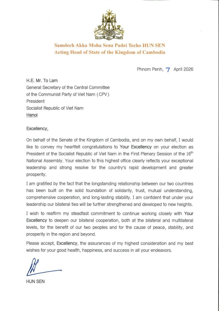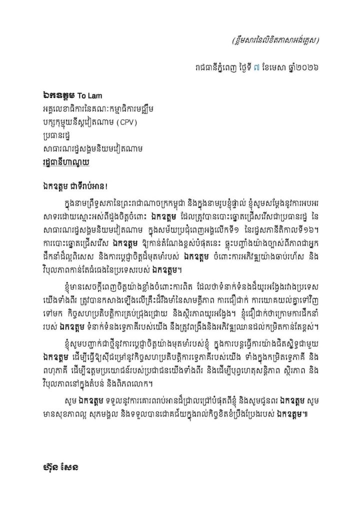 • លិខិតអបអរសារទររបស់សម្តេចអគ្គមហាសេនាបតីតេជោ ហ៊ុន សែន ប្រមុខរដ្ឋស្តីទី នៃព្រះរាជាណាចក្រកម្ពុជា ជូន ឯកឧត្តម To Lam អគ្គលេខាធិការនៃគណៈកម្មាធិការមជ្ឈឹម បក្សកុម្មុយនីស្តវៀតណាម(CPV) ដែលឯកឧត្តមត្រូវបានបោះឆ្នោតជ្រើសរើសជា «ប្រធានរដ្ឋ នៃសាធារណរដ្ឋសង្គមនិយមវៀតណាម» ក្នុងសម័យប្រជុំពេញអង្គលើកទី១ នៃរដ្ឋសភានីតិកាលទី១៦