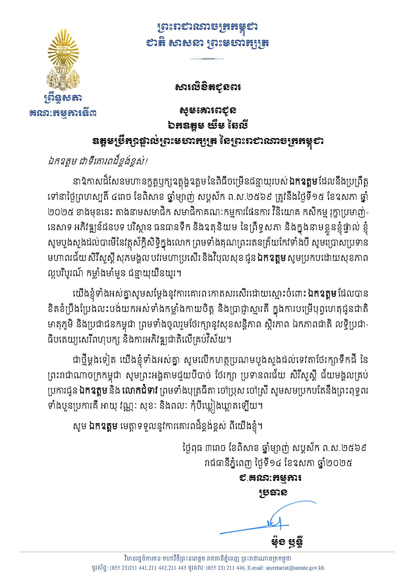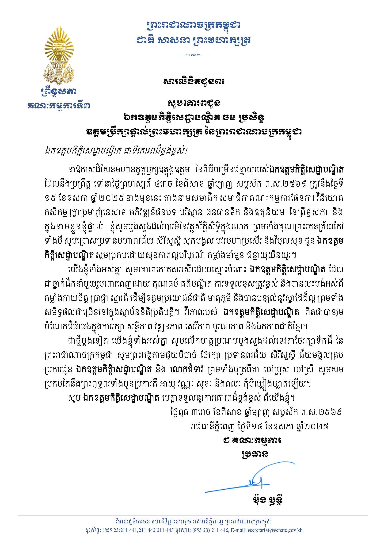 ថ្ងៃអាទិត្យ ទី១៨ ខែមិថុនា ឆ្នាំ២០២៣ វេលាម៉ោង៨:១០នាទី ឯកឧត្តម ម៉ាន់ ឈឿន អនុប្រធានគណៈកម្មការទី៧ ព្រឹទ្ធសភា និជាលេខាធិការក្រុមសមាជិកព្រឹទ្ធសភា ប្រចាំភូមិភាគទី១ បានរួមជាមួយ ឯឧជួបខុនសមាជិកក្រុមប្រឹក្សារាជធានីភ្នំពេញនិងថ្នាក់ដឹកនាំអង្គភាពប្រឆាំងអំពើពុករលួយ ក្នុងពិធី សិតទៀនវស្សាសមាទានសិល និងប្រគេនចង្ហាន់បិណ្ឌបាតថ្វាយព្រះសង្ឃចំនួន៣៣៦អង្គព្រមទាំងធ្វើបុណ្យចែកទានជូនប្រជារាស្ត្រក្នុងបរិវេណវត្តនាគវ័ន្ត ខណ្ឌទួលគោករាជធានីភ្នំពេញ ដោយទឹកចិត្តសទ្ធារីករាយ ជ្រះថ្លា និងអាណិតស្រឡាញ់ក្រៃលែង។