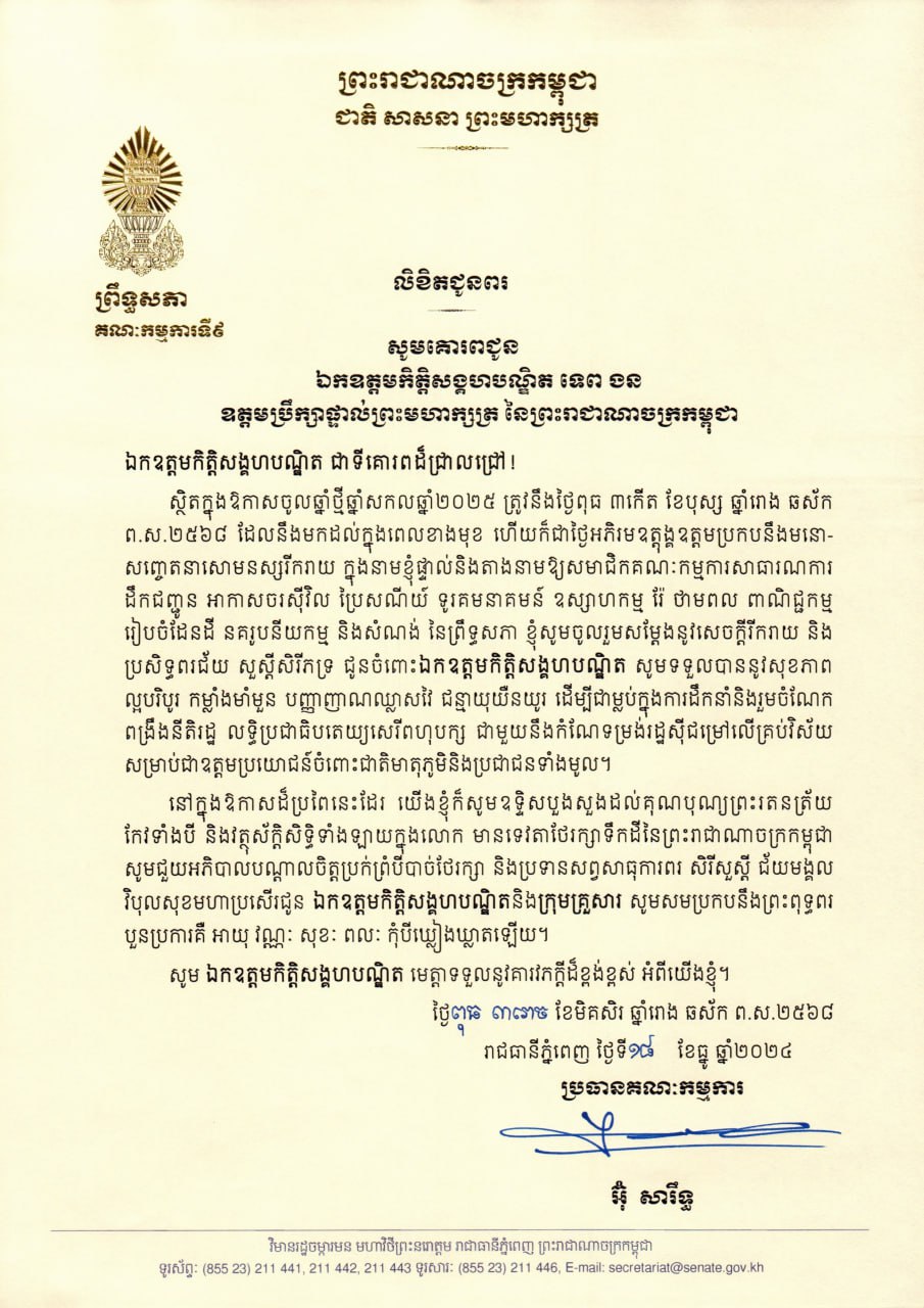 • សារលិខិតជូនពរ របស់ គណៈកម្មការទី៩ ព្រឹទ្ធសភា សូមគោរពជូន ឯកឧត្តមកិត្តិសង្គហបណ្ឌិត ទេព ងន ឧត្តមប្រឹក្សាផ្ទាល់ព្រះមហាក្សត្រ នៃព្រះរាជាណាចក្រកម្ពុជា