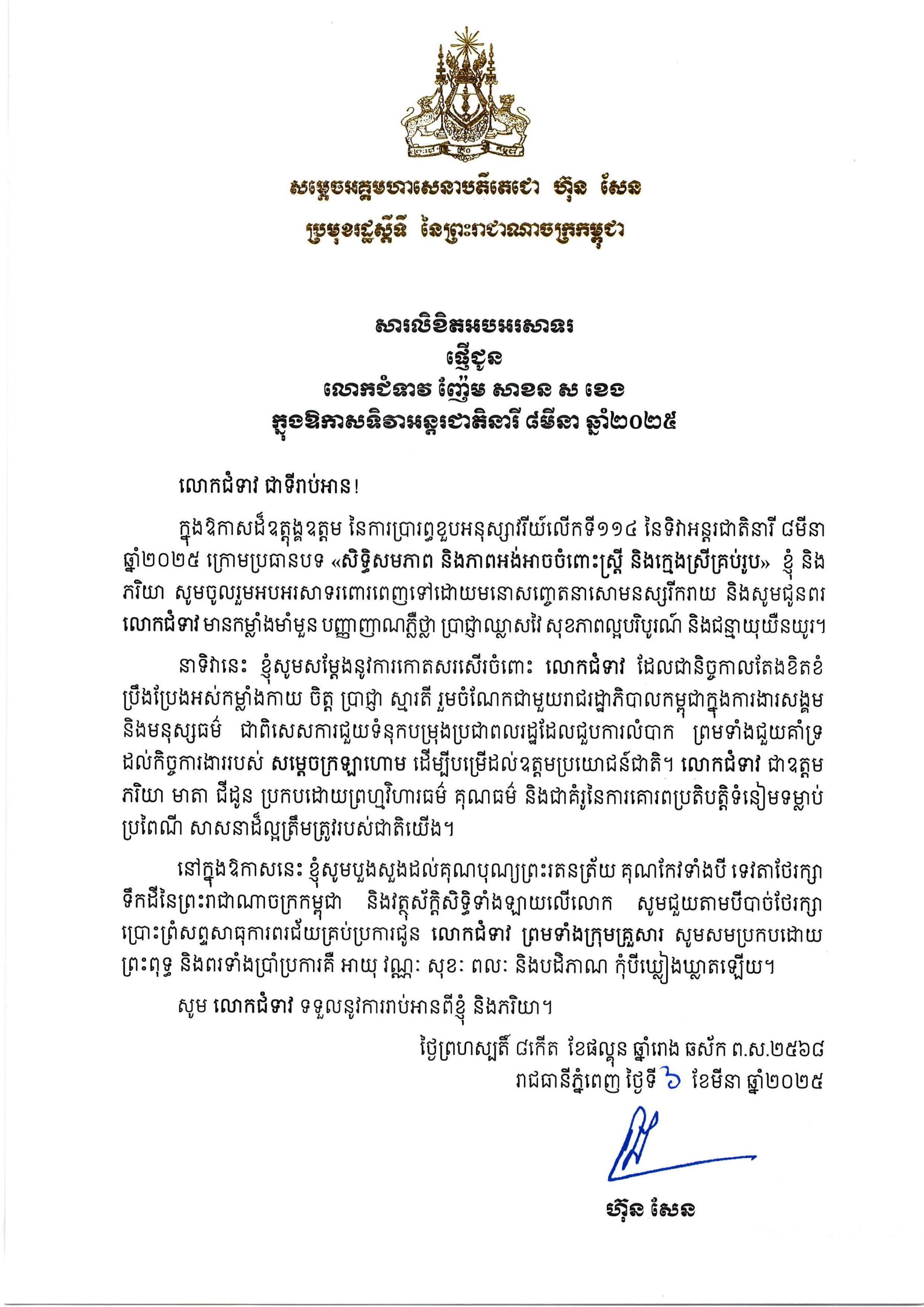 សារលិខិតជូនពររបស់ សម្តេចអគ្គមហាសេនាបតីតេជោ ហ៊ុន សែន ប្រមុខរដ្ឋស្តីទី ក្នុងឱកាស នៃការប្រារព្ធខួបលើកទី១១៤ នៃទិវាអន្តរជាតិនារី ៨មីនា ឆ្នាំ២០២៥ ក្រោមប្រធានបទ «សិទ្ធិ សមភាព និងភាពអង់អាច ចំពោះស្ត្រីនិងក្មេងស្រីគ្រប់រូប» ជូនលោកជំទាវ ញ៉ែម សាខន ស ខេង