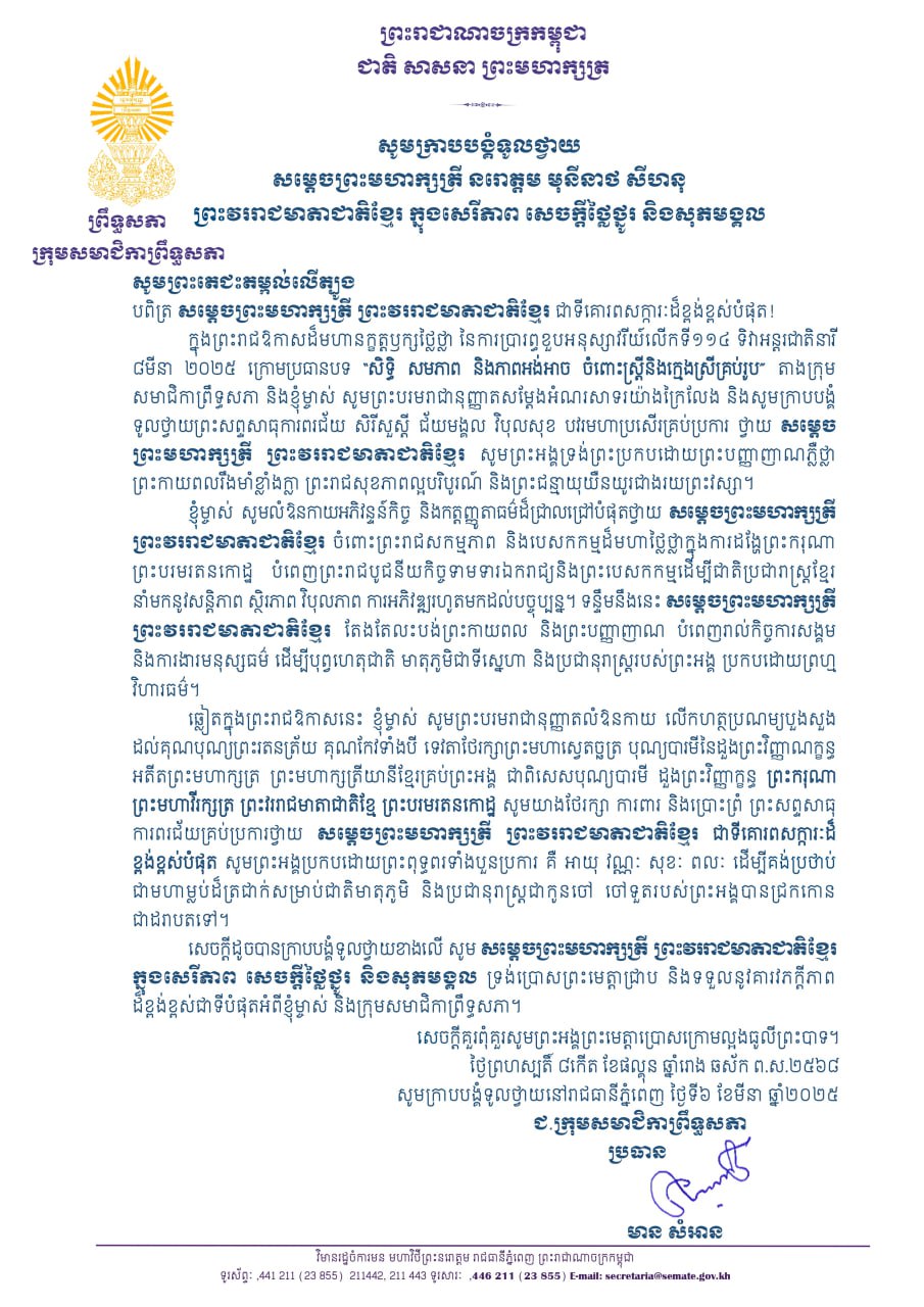 សារលិខិតថ្វាយព្រះពររបស់លោកជំទាវ មាន សំអាន ប្រធានក្រុមសមាជិកាព្រឹទ្ធសភា ថ្វាយព្រះពរ សម្តេចព្រះមហាក្សត្រី នរោត្តម មុនិនាថ សីហនុ ព្រះវររាជមាតាជាតិខ្មែរ ក្នុងសេរីភាព សេចក្តីថ្លៃថ្នូរ និងសុភមង្គល ក្នុងឱកាសដ៏មហាបក្ខត្តឫក្សថ្លៃថ្លា នៃការប្រារព្ធខួបអនុស្សាវរីយ៍លើកទី១១៤ ទិវាអន្តរជាតិនារី ៨មីនា ឆ្នាំ២០២៥ ក្រោមប្រធានបទ “សិទ្ធិ សមភាព និងភាពអង់អាច ចំពោះស្ត្រីនិងក្មេងស្រីគ្រប់រូប
