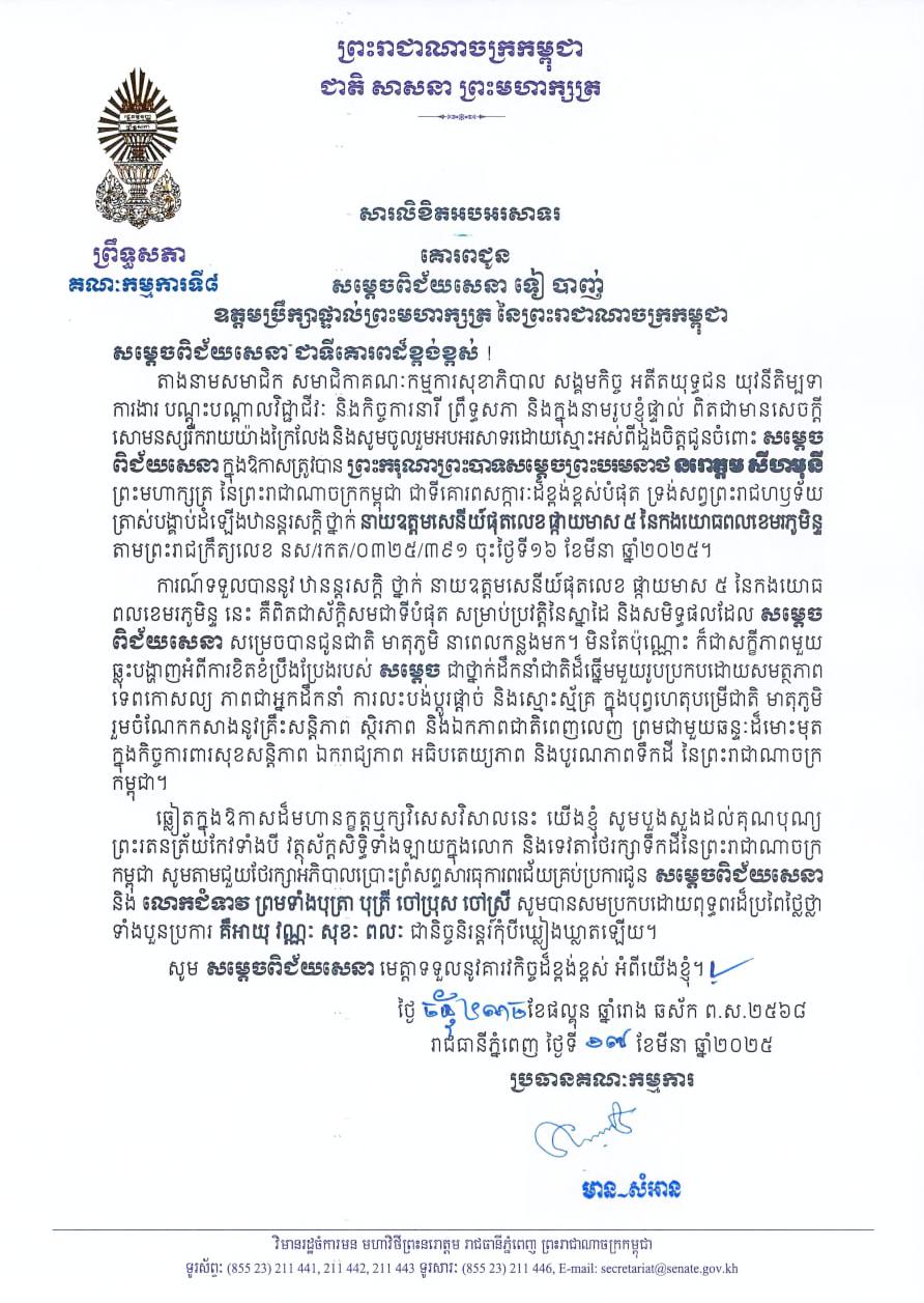 សារលិខិតអបអរសាទរ របស់ សមាជិក គណៈកម្មការទី៨ ព្រឹទ្ធសភា សូមគោរពជូន សម្តេចពិជ័យសេនា ទៀ បាញ់ ឧត្តមប្រឹក្សាផ្ទាល់ព្រះមហាក្សត្រ នៃព្រះរាជាណាចក្រកម្ពុជា