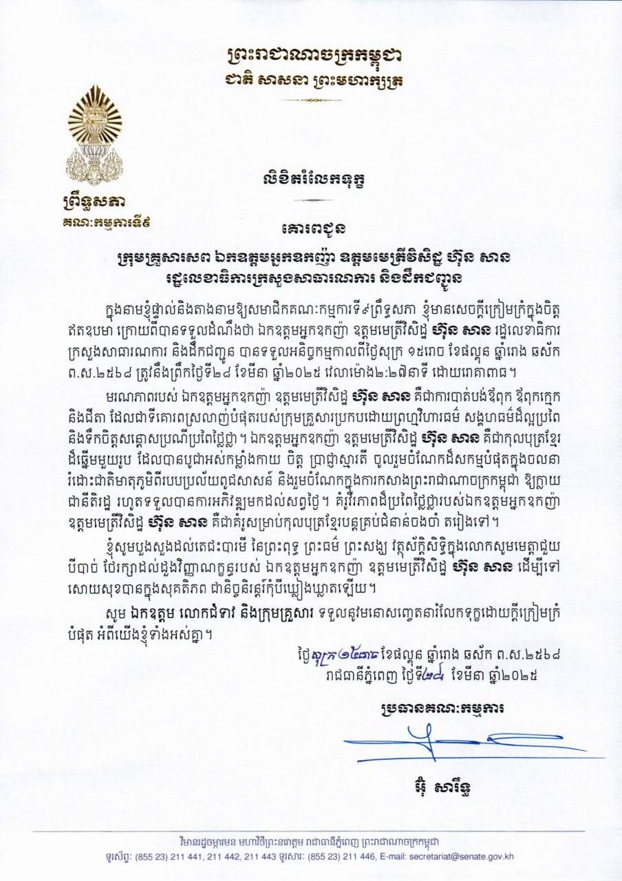 សារលិខិតរំលែកទុក្ខរបស់ឯកឧត្តម អ៊ុំ សារឹទ្ធ ប្រធានគណៈកម្មការទី៩ព្រឹទ្ធសភា គោរពជូនក្រុមគ្រួសារសព ឯកឧត្តមអ្នកឧកញ៉ា ឧត្តមមេត្រីវិសិដ្ឋ ហ៊ុន សាន រដ្ឋលេខាធិការ ក្រសួងសាធារណការ និងដឹកជញ្ជូន ចំពោះមរណភាពរបស់ឯកឧត្តមអ្នកឧកញ៉ា ឧត្តមមេត្រីវិសិដ្ឋ ដែលបានទទួលមរណភាព