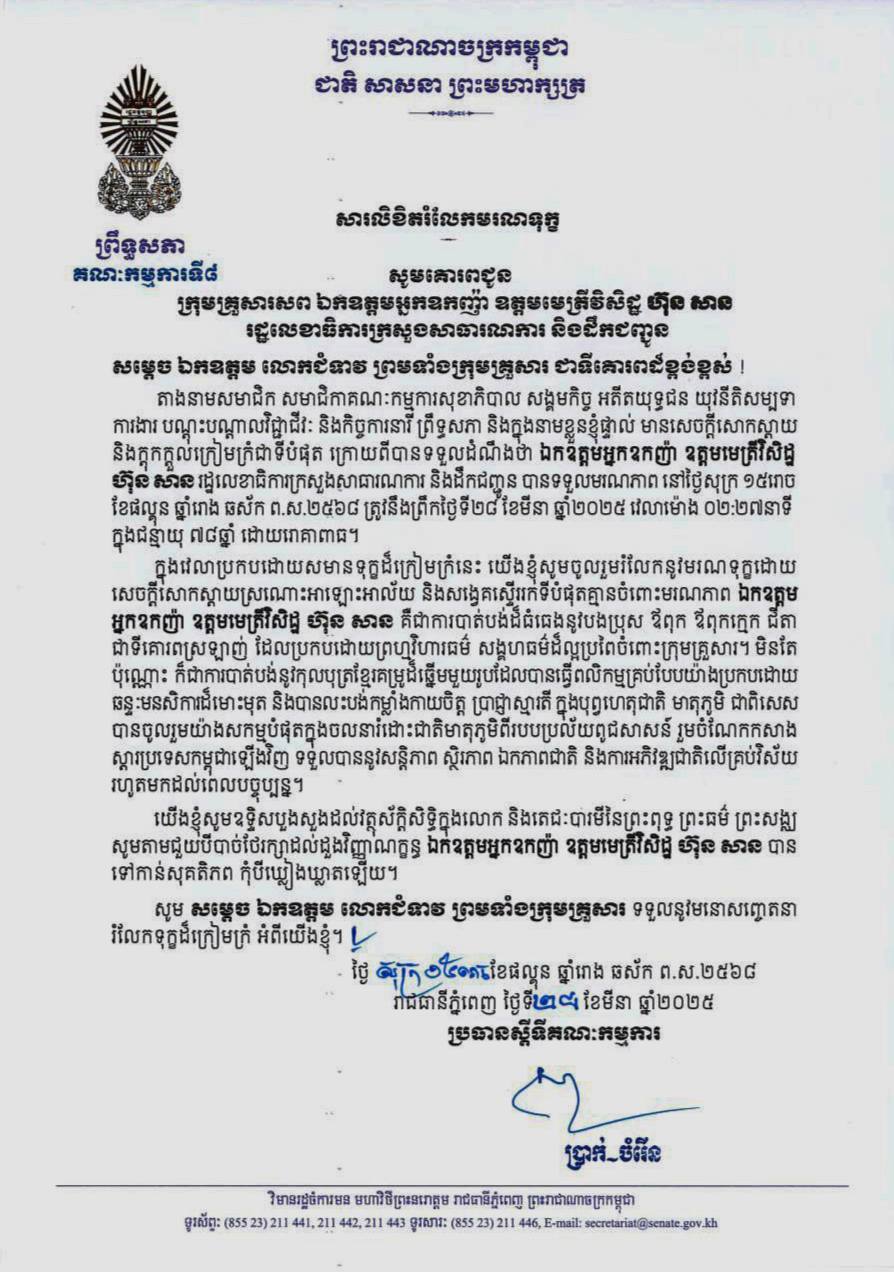 សារលិខិតរំលែកទុក្ខ របស់ ឯកឧត្តម ប្រាក់ ចំរើន ប្រធានស្តីទីគណៈកម្មការទី៨ ព្រឹទ្ធសភា សូមគោរពជូន ក្រុមគ្រួសារសព ឯកឧត្តមអ្នកឧកញ៉ា ឧត្តមមេត្រីវិសិដ្ឋ ហ៊ុន សាន រដ្ឋលេខាធិការ ក្រសួងសាធារណការ និងដឹកជញ្ជូន ចំពោះមរណភាពរបស់ឯកឧត្តមអ្នកឧកញ៉ា ឧត្តមមេត្រីវិសិដ្ឋ ដែលបានទទួលមរណភាព