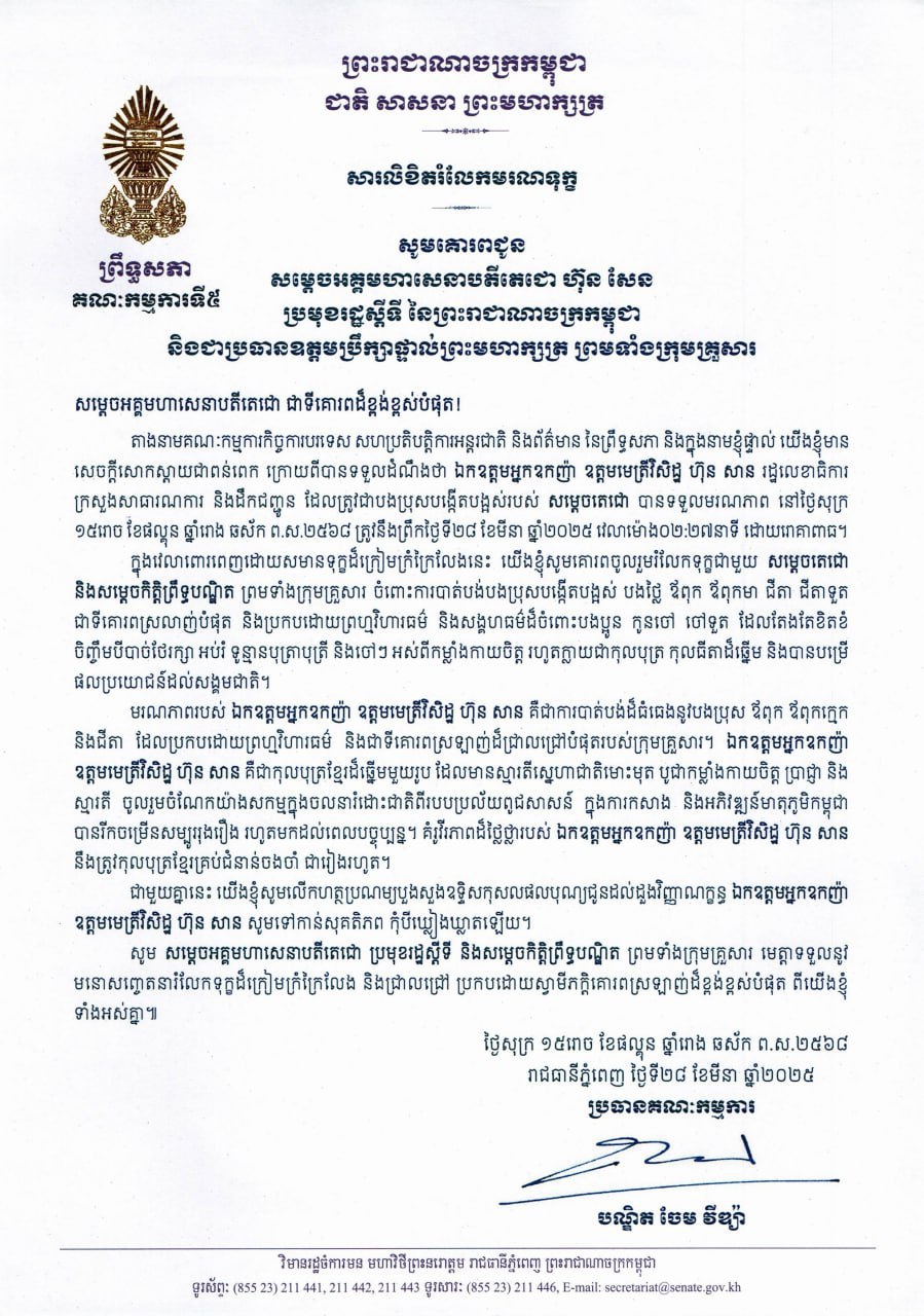 សារលិខិតរំលែកទុក្ខរបស់ឯកឧត្តមបណ្ឌិត ចែម វីឌ្យ៉ា ប្រធានគណៈកម្មការទី៥ព្រឹទ្ធសភា គោរពជូនសម្តេចអគ្គមហាសេនាបតីតេជោ ហ៊ុន សែន ប្រមុខរដ្ឋស្តីទី នៃព្រះរាជាណាចក្រកម្ពុជា និងជាប្រធានឧត្តមប្រឹក្សាផ្ទាល់ព្រះមហាក្សត្រ ព្រមទាំងក្រុមគ្រួសារ ចំពោះមរណភាពរបស់ឯកឧត្តមអ្នកឧកញ៉ា ឧត្តមមេត្រីវិសិដ្ឋ ហ៊ុន សាន រដ្ឋលេខាធិការ ក្រសួងសាធារណការ និងដឹកជញ្ជូន ត្រូវជាបងប្រុសបង្កើតបង្អស់របស់សម្តេចតេជោ ដែលបានទទួលមរណភាព