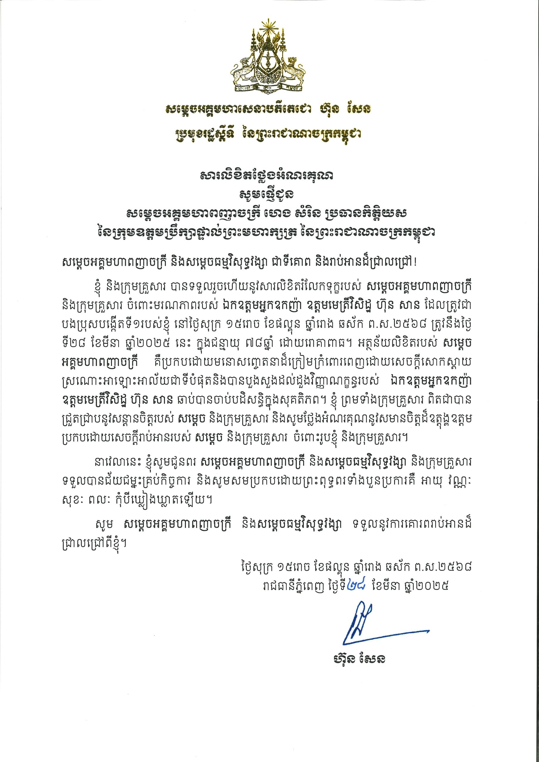 • សារលិខិតថ្លែងអំណរគុណរបស់សម្តេចអគ្គមហាសេនាបតីតេជោ ហ៊ុន សែន ប្រមុខរដ្ឋស្តីទី នៃព្រះរាជាណាចក្រកម្ពុជា ជូនសម្តេចអគ្គមហាពញាចក្រី ហេង សំរិន ប្រធានកិត្តិយស នៃក្រុមឧត្តមប្រឹក្សាផ្ទាល់ព្រះមហាក្សត្រ នៃព្រះរាជាណាចក្រកម្ពុជា ដែលសម្តេចអគ្គមហាពញាចក្រី បានផ្ញើសារលិខិតរំលែកទុក្ខ ចំពោះមរណភាពរបស់ ឯកឧត្តមអ្នកឧកញ៉ា ឧត្តមមេត្រីវិសិដ្ឋ ហ៊ុន សាន ដែលត្រូវជាបងប្រុសបង្កើតទី១របស់សម្តេចតេជោ