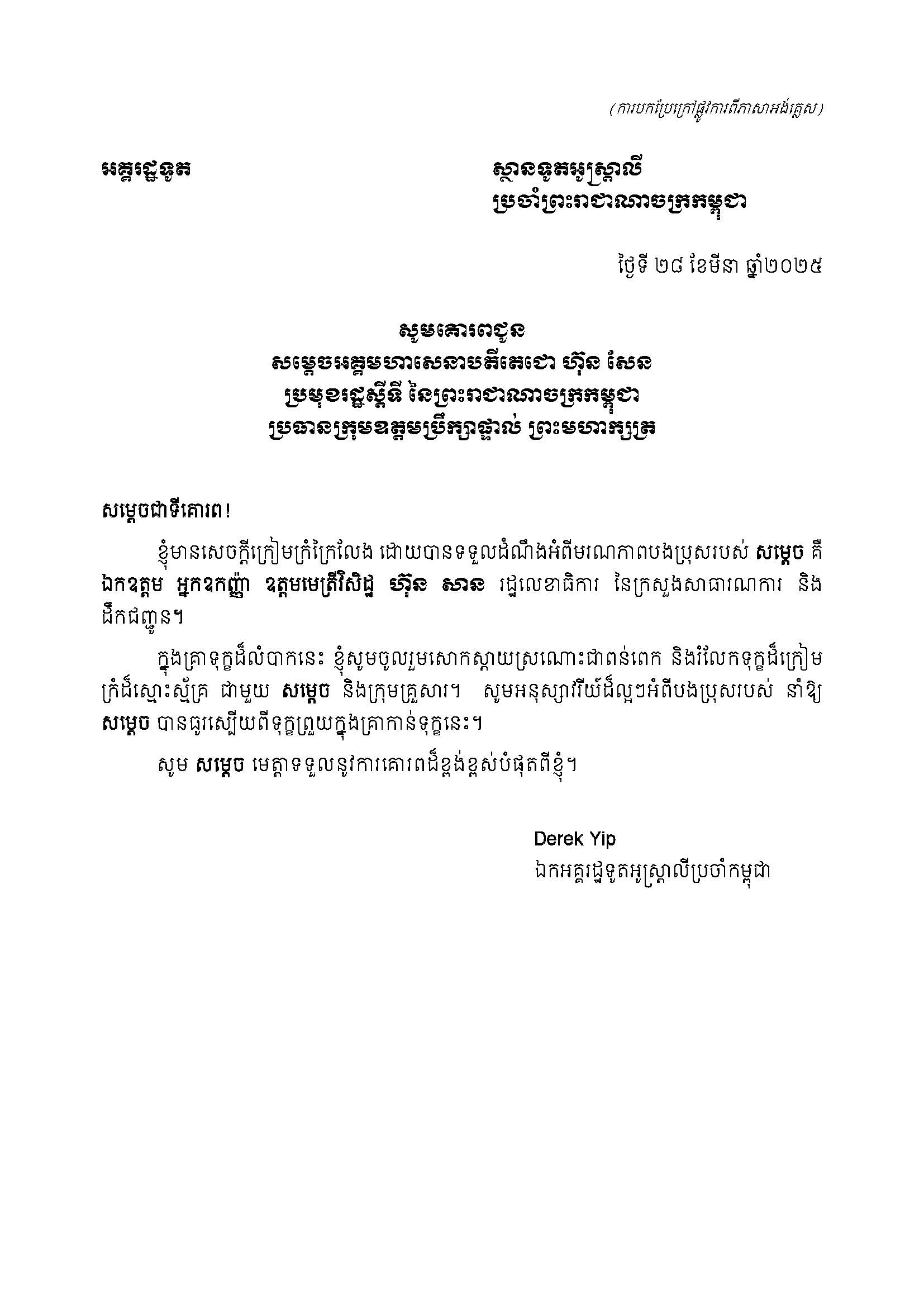 • សារលិខិតរំលែកទុក្ខរបស់ ឯកឧត្តម Derek Yip ឯកអគ្គរដ្ឋទូតអូស្ត្រាលីប្រចាំកម្ពុជា គោរពជូនសម្តេចអគ្គមហាសេនាបតីតេជោ ហ៊ុន សែន ប្រមុខរដ្ឋស្តីទី នៃព្រះរាជាណាចក្រកម្ពុជា ប្រធានក្រុមឧត្តមប្រឹក្សាផ្ទាល់ព្រះមហាក្សត្រ ចំពោះមរណភាពបងប្រុសរបស់សម្តេចតេជោ គឺ ឯកឧត្តម អ្នកឧកញ៉ា ឧត្តមមេត្រីវិសិដ្ឋ ហ៊ុន សាន រដ្ឋលេខាធិការ នៃក្រសួងសាធារណការ និងដឹកជញ្ជូន