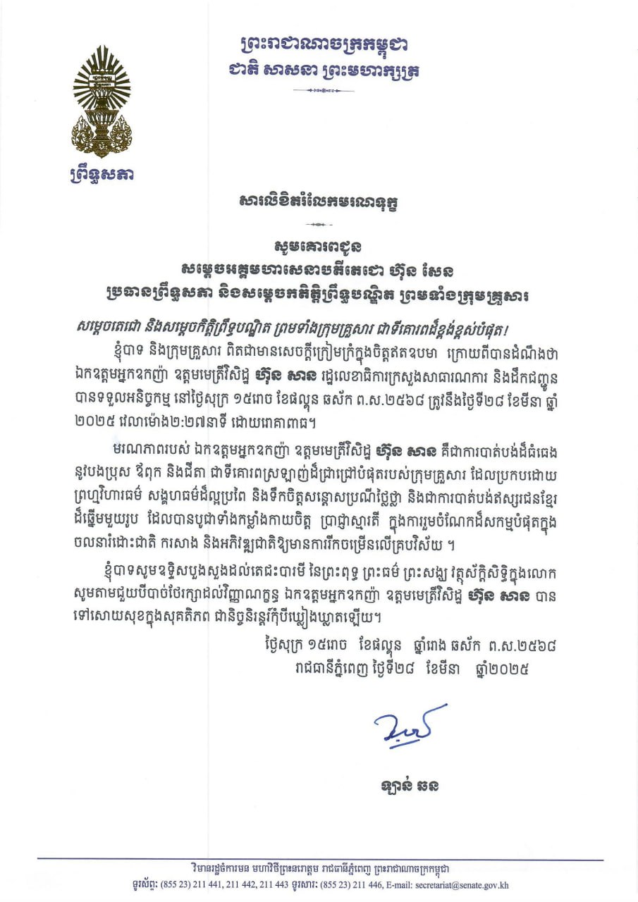សារលិខិតរំលែកទុក្ខរបស់ឯកឧត្តម ឡាន់ ឆន លេខាធិការគណៈកម្មការទី១០ព្រឹទ្ធសភា គោរពជូន សម្តេចអគ្គមហាសេនាបតីតេជោ ហ៊ុន សែន ប្រធានព្រឹទ្ធសភា និងសម្តេចកិត្តិព្រឹទ្ធបណ្ឌិត ព្រមទាំងក្រុមគ្រួសារ ចំពោះមរណភាពរបស់ ឯកឧត្តមអ្នកឧកញ៉ា ឧត្តមមេត្រីវិសិដ្ឋ ហ៊ុន សាន រដ្ឋលេខាធិការក្រសួងសាធារណការ និងដឹកជញ្ជូន ដែលបានទទួលមរណភាព