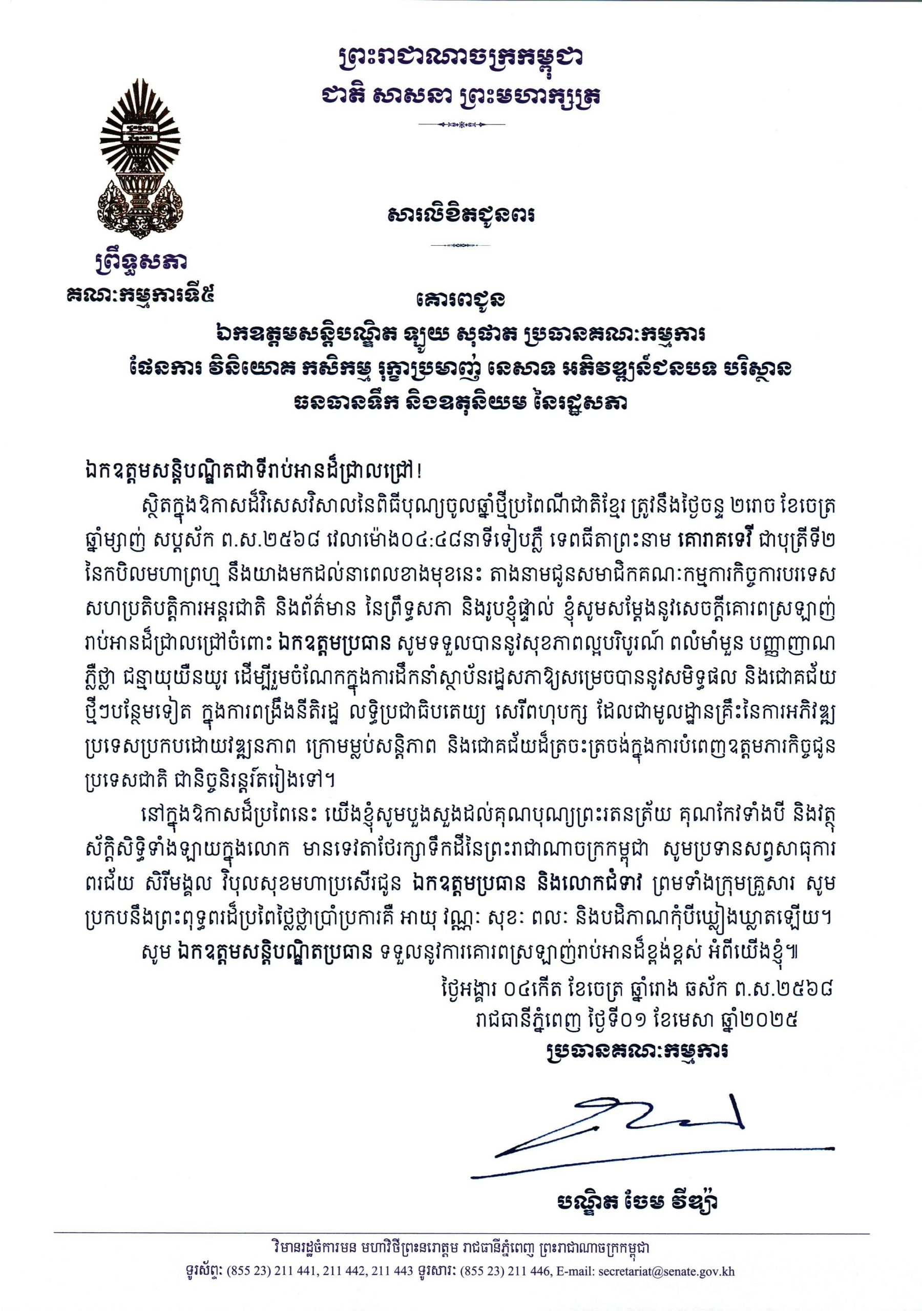 សារលិខិតជូនពរ របស់ ឯកឧត្តមបណ្ឌិត ចែម វីឌ្យ៉ា ប្រធានគណៈកម្មការទី៥ ព្រឹទ្ធសភា សូមគោរពជូន ឯកឧត្តមសន្តិបណ្ឌិត ឡូយ សុផាត ប្រធានគណៈកម្មការទី៣រដ្ឋសភា នៃព្រះរាជាណាចក្រកម្ពុជា