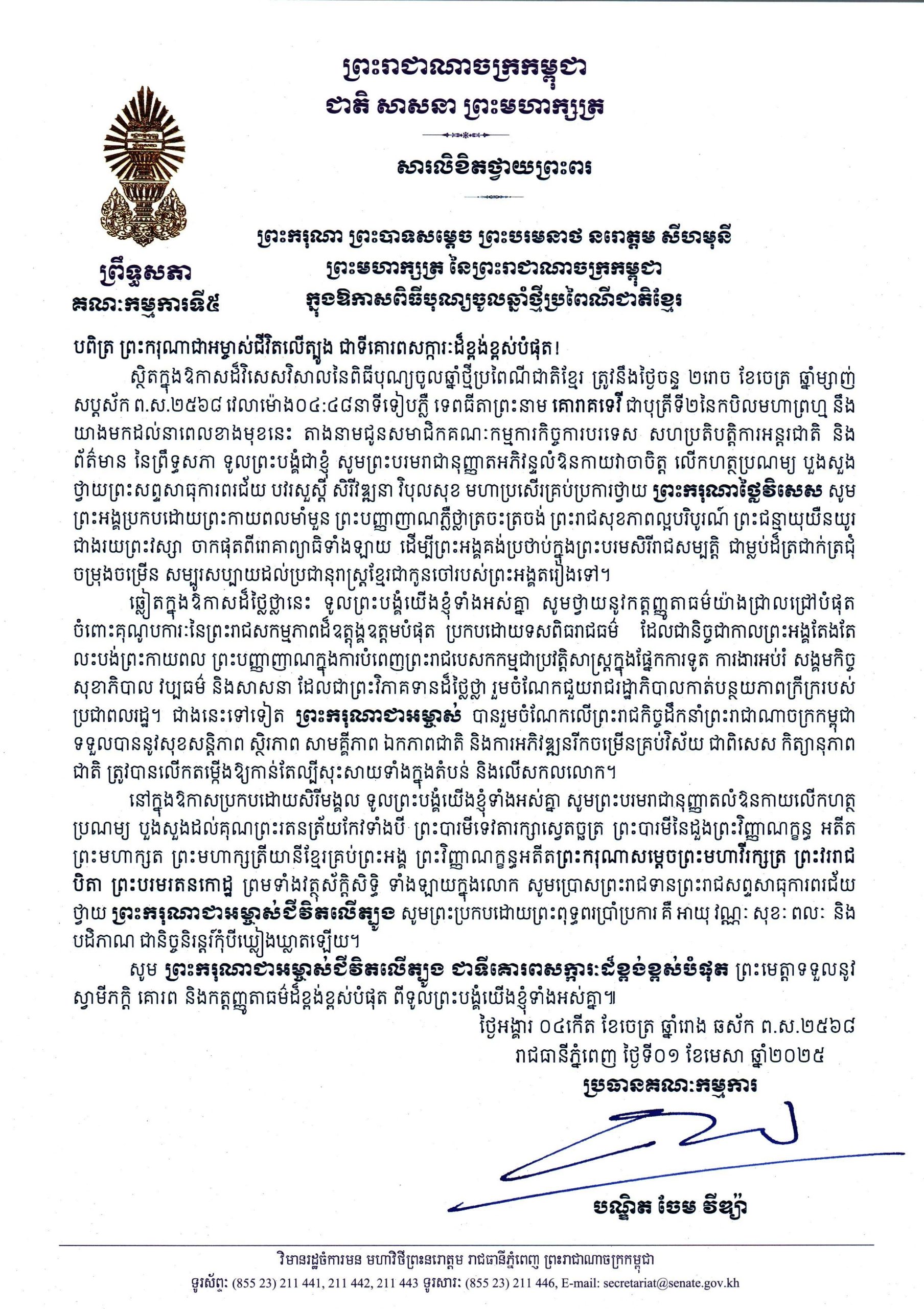 សារលិខិតថ្វាយព្រះពររបស់ឯកឧត្តមបណ្ឌិត ចែម វីឌ្យ៉ា ប្រធានគណៈកម្មការទី៥ព្រឹទ្ធសភា ថ្វាយព្រះពរ ព្រះករុណា ព្រះបាទសម្តេច ព្រះបរមនាថ នរោត្តម សីហមុនី ព្រះមហាក្សត្រ នៃព្រះរាជាណាចក្រកម្ពុជា ក្នុងឱកាសពិធីបុណ្យចូលឆ្នាំថ្មីប្រពៃណីជាតិខ្មែរ ឆ្នាំម្សាញ់ សប្តស័ក ព.ស.២៥៦៨