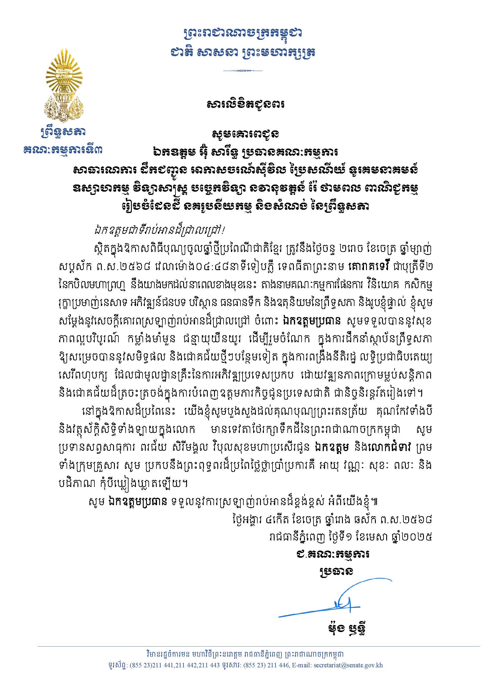 សារលិខិតជូនពររបស់ឯកឧត្តមបណ្ឌិត ម៉ុង ឫទ្ធី ប្រធានគណៈកម្មការទី៣ព្រឹទ្ធសភា ជូនពរក្នុងឱកាសពិធីបុណ្យចូលឆ្នាំថ្មីប្រពៃណីជាតិខ្មែរ ឆ្នាំម្សាញ់ សប្តស័ក ព.ស.២៥៦៨ គោរពជូន ឯកឧត្តម អ៊ុំ សារឹទ្ធ ប្រធានគណៈកម្មការសាធារណការទី៩ព្រឹទ្ធសភា