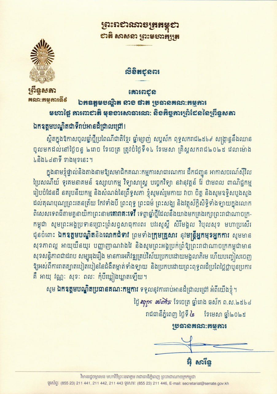 សារលិខិតជូនពររបស់ប្រធានគណៈកម្មការទី៩ព្រឹទ្ធសភា ជូនពរក្នុងឱកាសពិធីបុណ្យចូលឆ្នាំថ្មីប្រពៃណីជាតិខ្មែរ ឆ្នាំម្សាញ់ សប្តស័ក ព.ស.២៥៦៨ គោរព ឯកឧត្តមបណ្ឌិត នាង ផាត ប្រធានគណៈកម្មការទី៤ នៃព្រឹទ្ធសភា
