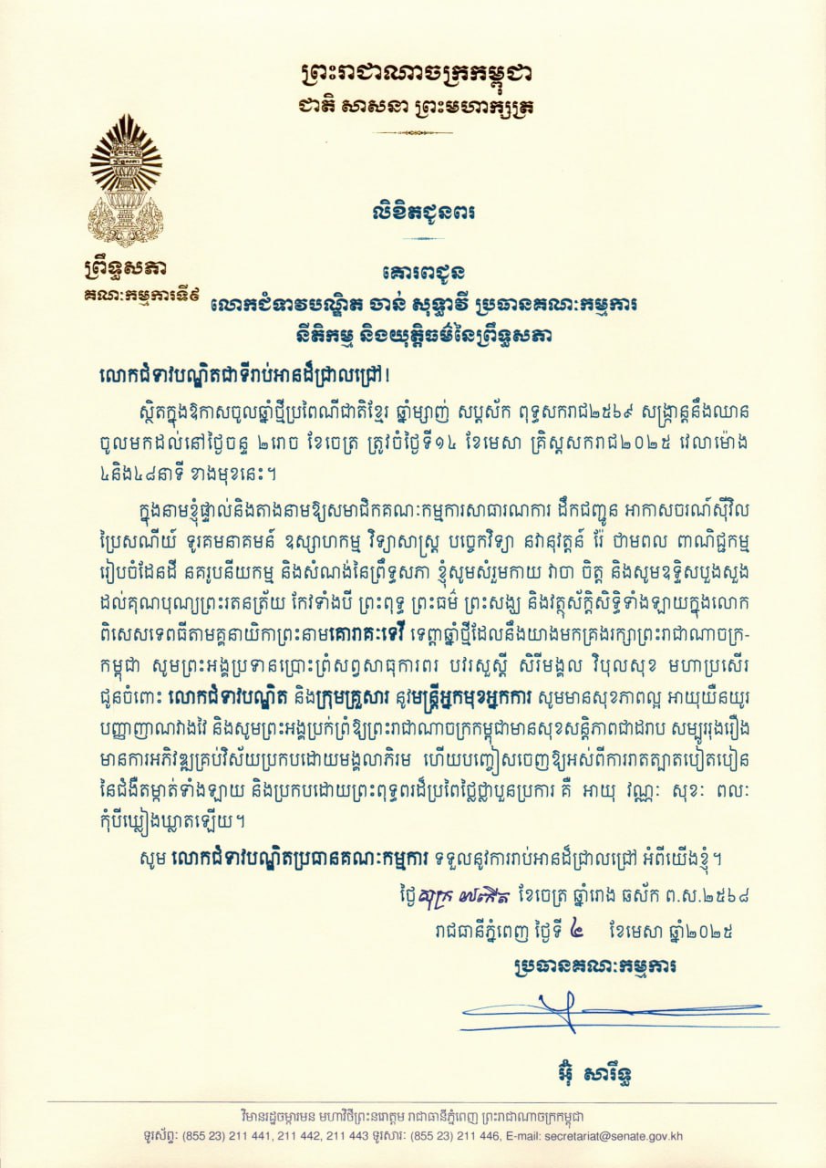• សារលិខិតជូនពររបស់ប្រធានគណៈកម្មការទី៩ព្រឹទ្ធសភា ជូនពរក្នុងឱកាសពិធីបុណ្យចូលឆ្នាំថ្មីប្រពៃណីជាតិខ្មែរ ឆ្នាំម្សាញ់ សប្តស័ក ព.ស.២៥៦៨ គោរព លោកជំទាវបណ្ឌិត ចាន់ សុទ្ធាវី ប្រធានគណៈកម្មការទី៦ នៃព្រឹទ្ធសភា