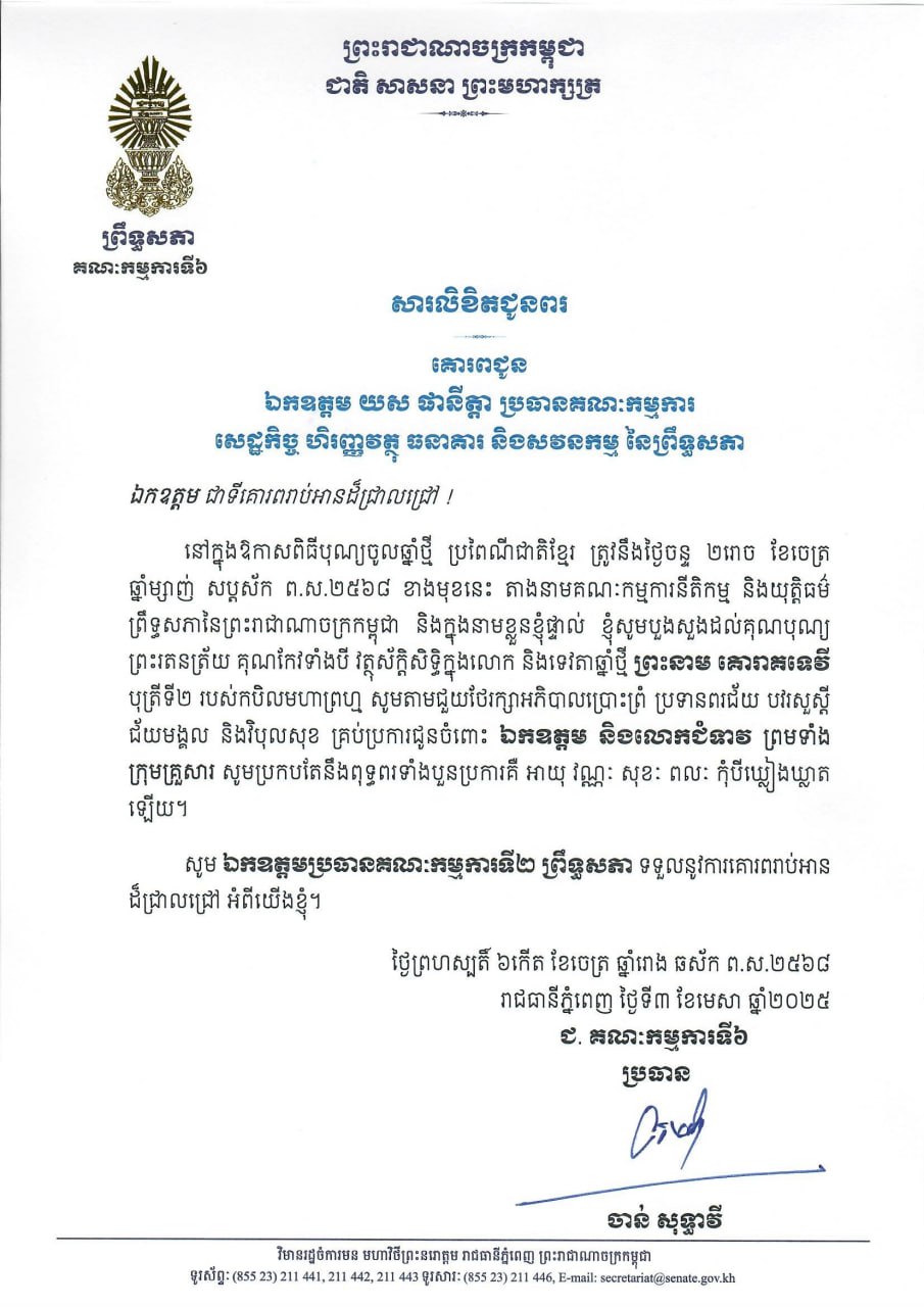 សារលិខិតជូនពររបស់ប្រធានគណៈកម្មការទី៦ព្រឹទ្ធសភា ជូនពរក្នុងឱកាសពិធីបុណ្យចូលឆ្នាំថ្មីប្រពៃណីជាតិខ្មែរ ឆ្នាំម្សាញ់ សប្តស័ក ព.ស.២៥៦៨ គោរពជូន ឯកឧត្តម យស ផានីត្តា ប្រធានគណៈកម្មការទី២ព្រឹទ្ធសភា