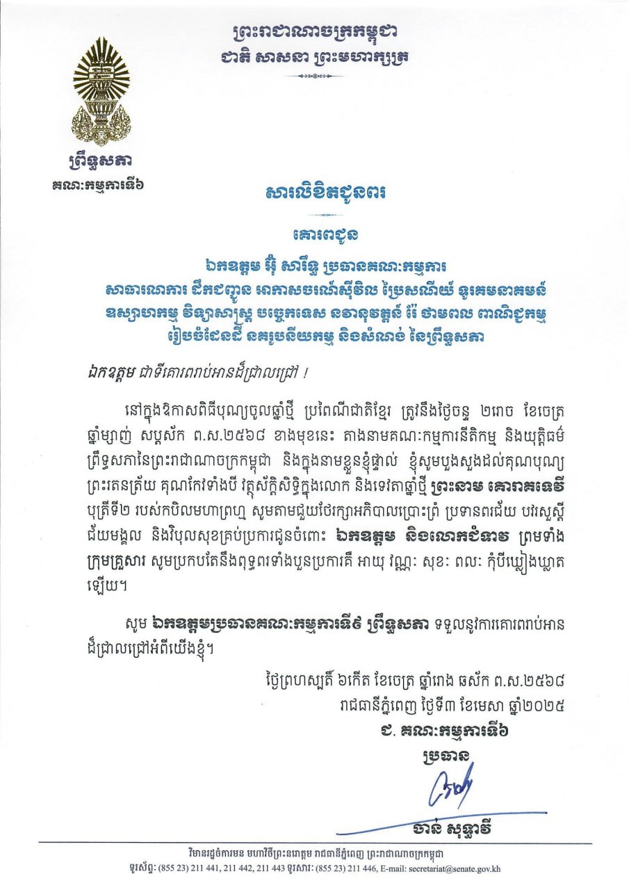 សារលិខិតជូនពររបស់ប្រធានគណៈកម្មការទី៦ព្រឹទ្ធសភា ជូនពរក្នុងឱកាសពិធីបុណ្យចូលឆ្នាំថ្មីប្រពៃណីជាតិខ្មែរ ឆ្នាំម្សាញ់ សប្តស័ក ព.ស.២៥៦៨ គោរពជូន ឯកឧត្តម អ៊ុំ សារឹទ្ធ ប្រធានគណៈកម្មការទី៩ព្រឹទ្ធសភា