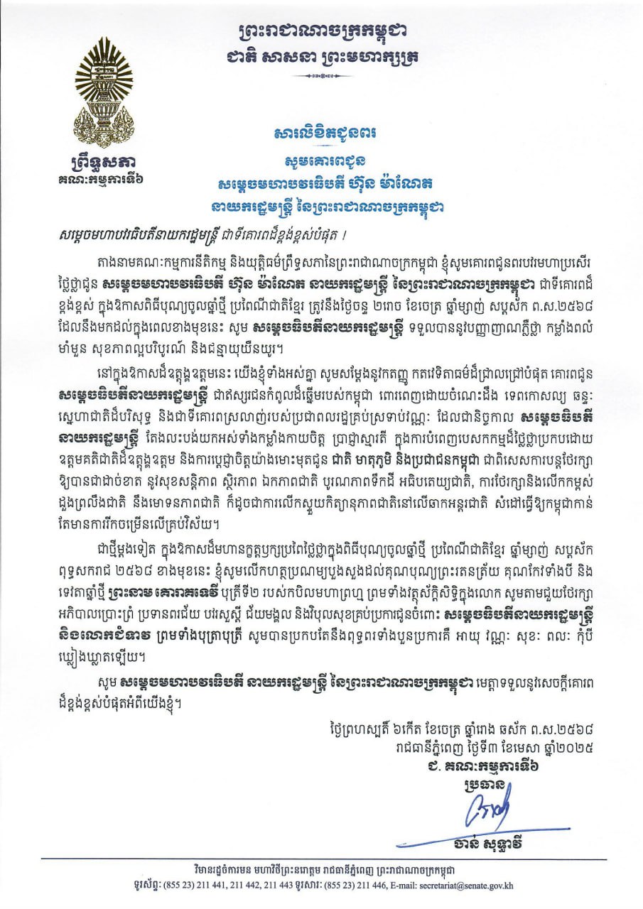 សារលិខិតជូនពររបស់ប្រធានគណៈកម្មការទី៦ព្រឹទ្ធសភា ជូនពរក្នុងឱកាសពិធីបុណ្យចូលឆ្នាំថ្មីប្រពៃណីជាតិខ្មែរ ឆ្នាំម្សាញ់ សប្តស័ក ព.ស.២៥៦៨ គោរពជូន សម្តេចមហាបវរធិបតី ហ៊ុន ម៉ាណែត នាយករដ្ឋមន្ត្រី នៃព្រះរាជាណាចក្រកម្ពុជា
