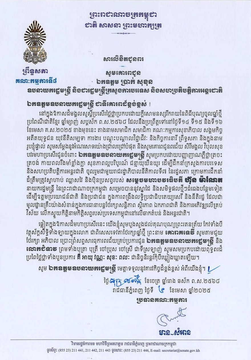 សារលិខិតជូនពររបស់ប្រធានគណៈកម្មការទី៨ព្រឹទ្ធសភា ជូនពរក្នុងឱកាសពិធីបុណ្យចូលឆ្នាំថ្មីប្រពៃណីជាតិខ្មែរ ឆ្នាំម្សាញ់ សប្តស័ក ព.ស.២៥៦៩ គោរពជូន ឯកឧត្តម ប្រាក់ សុខុន ឧបនាយករដ្ឋមន្ត្រីរដ្ឋមន្ត្រីក្រសួងការបរទេស និងសហប្រតិបត្តិការអន្តរជាតិ