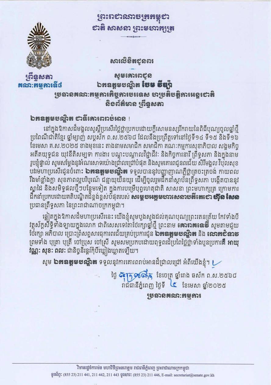 សារលិខិតជូនពររបស់ប្រធានគណៈកម្មការទី៨ព្រឹទ្ធសភា ជូនពរក្នុងឱកាសពិធីបុណ្យចូលឆ្នាំថ្មីប្រពៃណីជាតិខ្មែរ ឆ្នាំម្សាញ់ សប្តស័ក ព.ស.២៥៦៨ គោរពជូន ឯកឧត្តមបណ្ឌិត ចែម វីឌ្យ៉ា ប្រធានគណៈកម្មការទី៥ព្រឹទ្ធសភា
