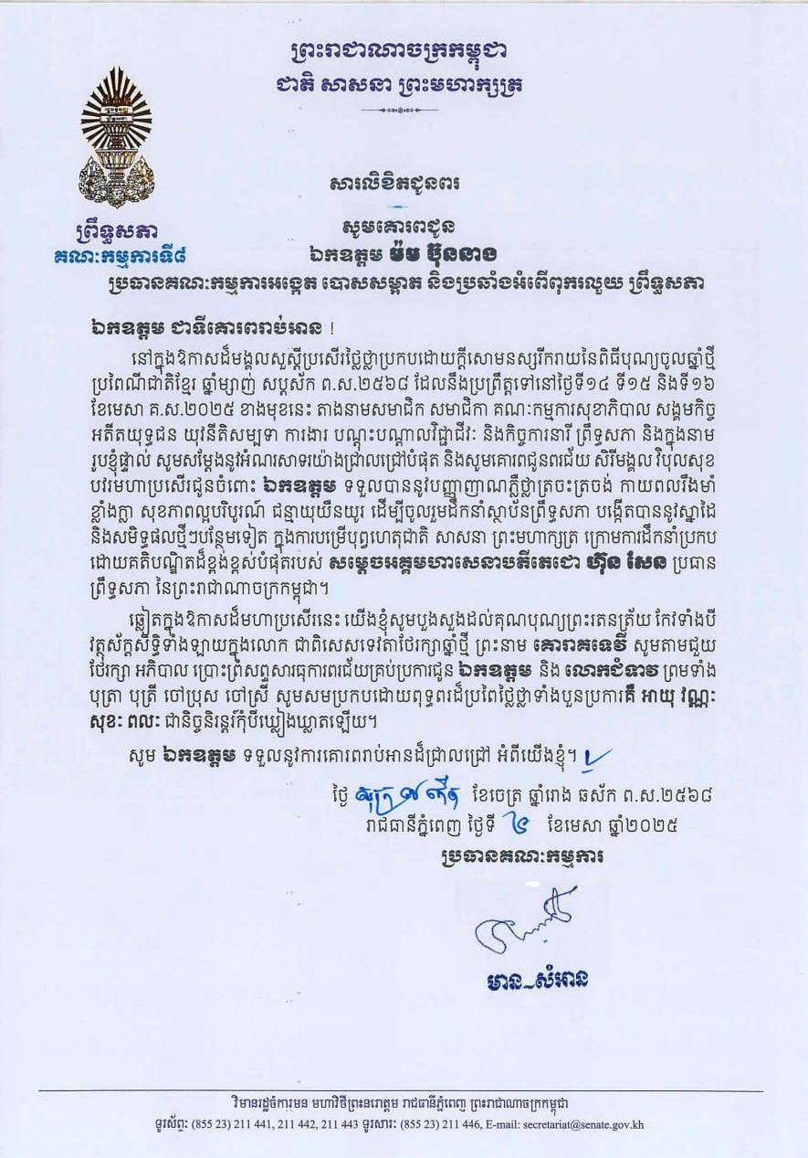 សារលិខិតជូនពររបស់ប្រធានគណៈកម្មការទី៨ព្រឹទ្ធសភា ជូនពរក្នុងឱកាសពិធីបុណ្យចូលឆ្នាំថ្មីប្រពៃណីជាតិខ្មែរ ឆ្នាំម្សាញ់ សប្តស័ក ព.ស.២៥៦៨ គោរពជូន ឯកឧត្តម ម៉ម ប៊ុននាង ប្រធានគណៈកម្មការទី១០ព្រឹទ្ធសភា