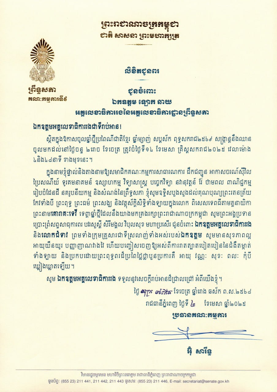 សារលិខិតជូនពររបស់ឯកឧត្តម ឡាយ សំកុល អគ្គលេខាធិការព្រឹទ្ធសភា គោរពជូន សម្តេចកិត្តិព្រឹទ្ធបណ្ឌិត ប៊ុន រ៉ានី ហ៊ុន សែន ប្រធានកាកបាទក្រហមកម្ពុជា ក្នុងឱកាសដ៏ឧត្តុង្គឧត្តមប្រកបដោយក្តីសោមនស្សរីករាយ នៃពិធីចម្រើនជន្មាយុរបស់ សម្តេចកិត្តិព្រឹទ្ធបណ្ឌិត ដែលនឹងប្រព្រឹត្តទៅនៅថ្ងៃទី១៥ ខែធ្នូ ឆ្នាំ២០២៥ ខាងមុខនេះ