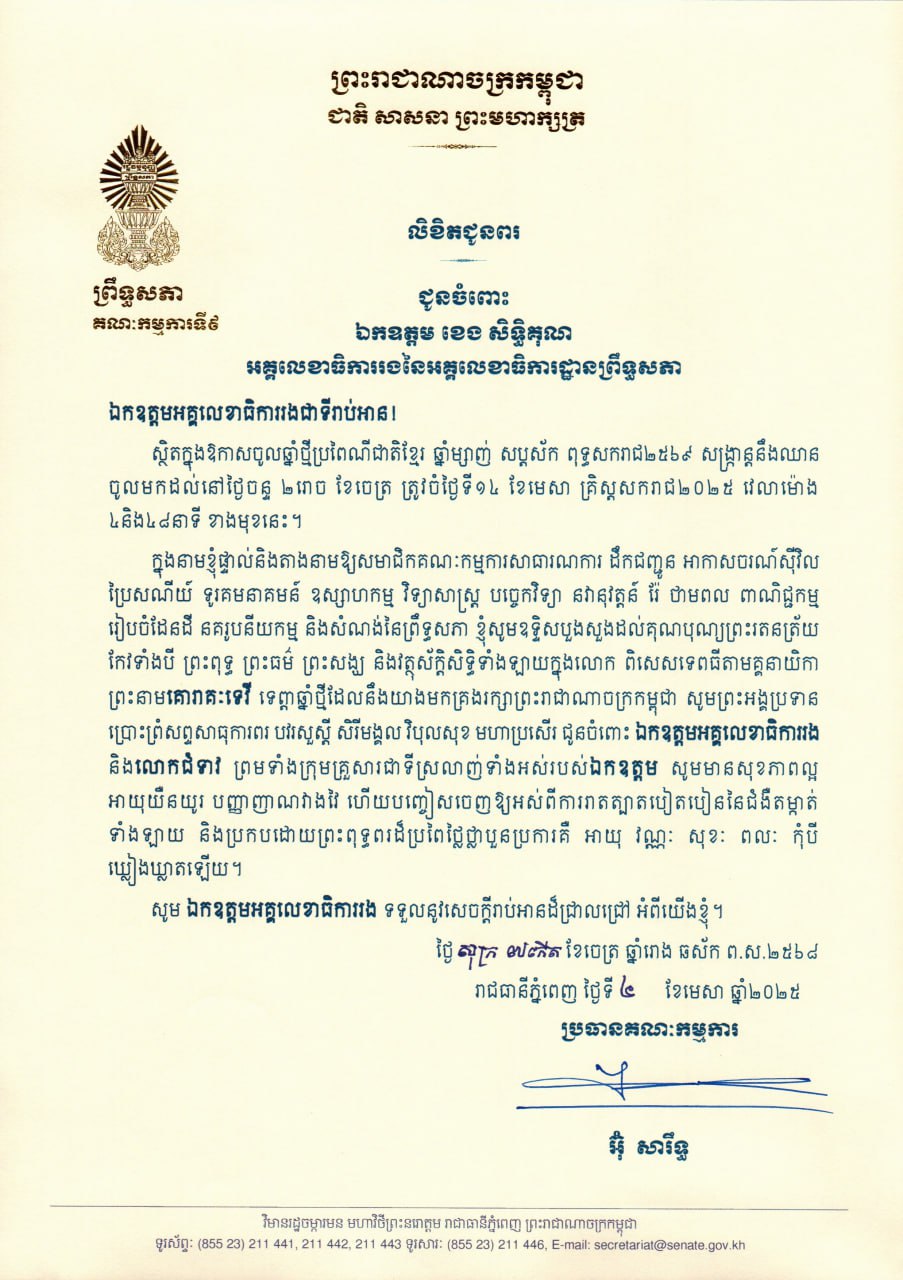 • សារលិខិតជូនពររបស់ប្រធានគណៈកម្មការទី៩ព្រឹទ្ធសភា ជូនពរក្នុងឱកាសពិធីបុណ្យចូលឆ្នាំថ្មីប្រពៃណីជាតិខ្មែរ ឆ្នាំម្សាញ់ សប្តស័ក ព.ស.២៥៦៨ គោរពជូន ឯកឧត្តម ខេង សិទ្ធិគុណ
