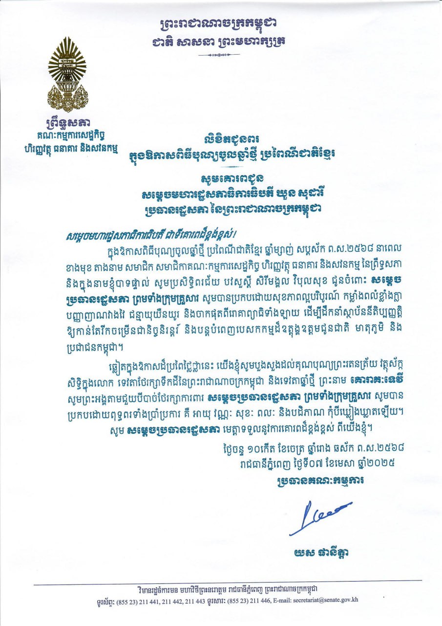 លិខិតជូនពររបស់គណៈកម្មការទី២ ព្រឹទ្ធសភា គោរពជូន សម្តេចមហារដ្ឋសភាធិការធិបតី ឃួន សុដារី ប្រធានរដ្ឋសភា នៃព្រះរាជាណាចក្រកម្ពុជា ក្នុងឱកាសពិធីបុណ្យចូលឆ្នាំថ្មីប្រពៃណីជាតិខ្មែរ