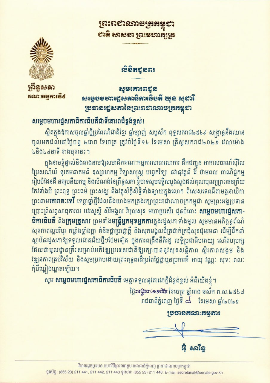 • លិខិតជូនពររបស់គណៈកម្មការសាធារណការទី៩ ព្រឹទ្ធសភា ជូនពរក្នុងឱកាសចូលឆ្នាំថ្មីប្រពៃណីជាតិខ្មែរ ឆ្នាំម្សាញ់ សប្តស័ក ព.ស.២៥៦៩ សូមគោរពជូន សម្តេចមហារដ្ឋសភាធិការធិបតី ឃួន សុដារី ប្រធានរដ្ឋសភានៃព្រះរាជាណាចក្រកម្ពុជា