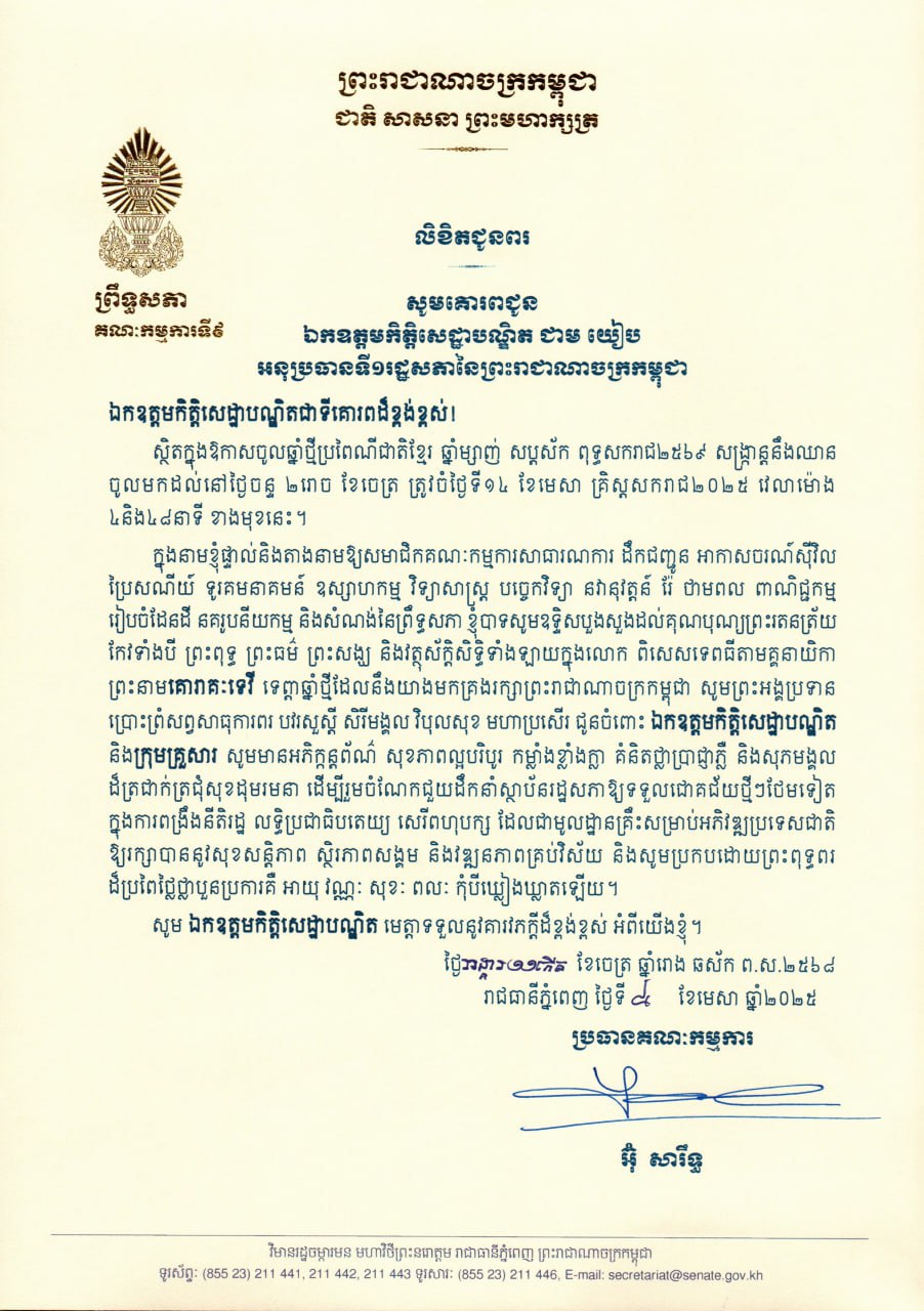 លិខិតជូនពររបស់គណៈកម្មការសាធារណការទី៩ ព្រឹទ្ធសភា ជូនពរក្នុងឱកាសចូលឆ្នាំថ្មីប្រពៃណីជាតិខ្មែរ ឆ្នាំម្សាញ់ សប្តស័ក ព.ស.២៥៦៩ សូមគោរពជូន ឯកឧត្តមកិត្តិសេដ្ឋាបណ្ឌិត ជាម យៀប អនុប្រធានទី១រដ្ឋសភានៃព្រះរាជាណាចក្រកម្ពុជា