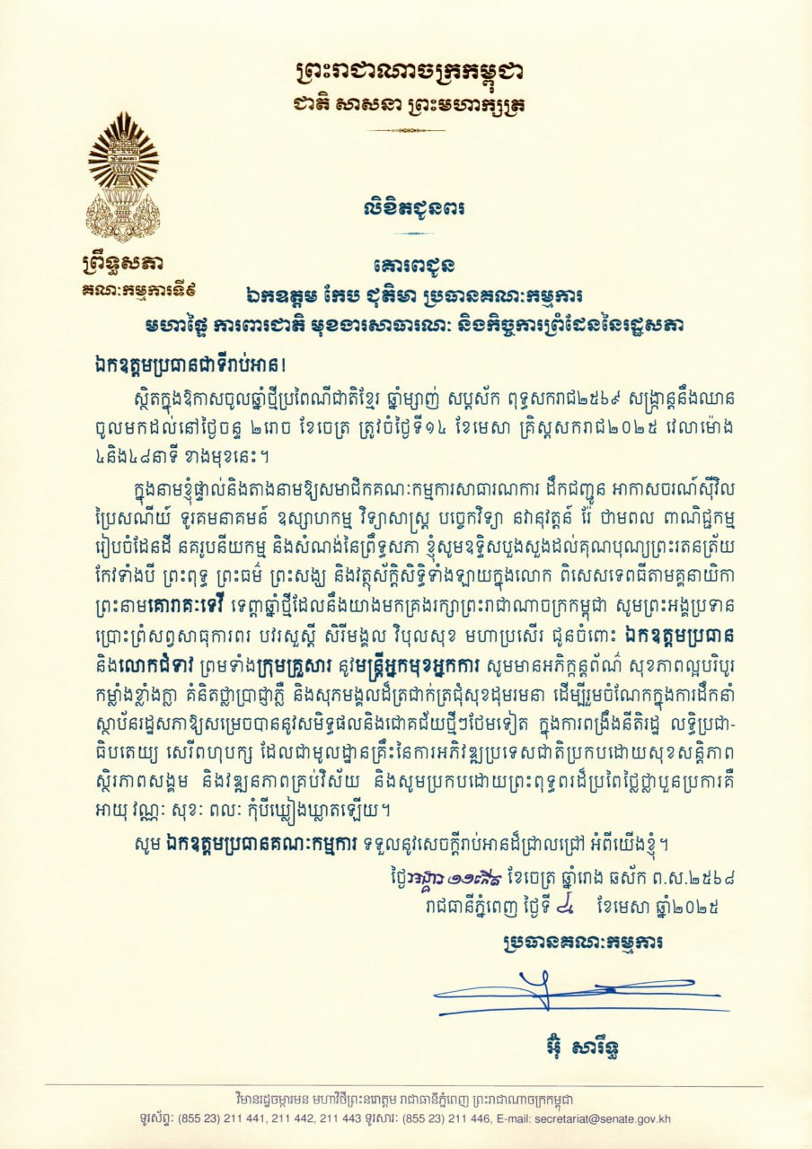 • លិខិតជូនពររបស់គណៈកម្មការសាធារណការទី៩ ព្រឹទ្ធសភា ជូនពរក្នុងឱកាសចូលឆ្នាំថ្មីប្រពៃណីជាតិខ្មែរ ឆ្នាំម្សាញ់ សប្តស័ក ព.ស.២៥៦៩ សូមគោរពជូន ឯកឧត្តម កែប ជុតិមា ប្រធានគណៈកម្មការមហាផ្ទៃ ការពារជាតិ មុខងារសាធារណៈ និងកិច្ចការព្រំដែននៃរដ្ឋសភា