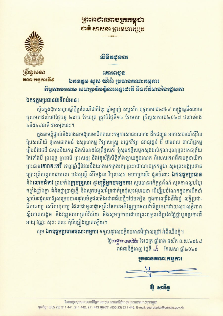 លិខិតជូនពររបស់គណៈកម្មការសាធារណការទី៩ ព្រឹទ្ធសភា ជូនពរក្នុងឱកាសចូលឆ្នាំថ្មីប្រពៃណីជាតិខ្មែរ ឆ្នាំម្សាញ់ សប្តស័ក ព.ស.២៥៦៩ សូមគោរពជូន ឯកឧត្តម សួស យ៉ារ៉ា ប្រធានគណៈកម្មការកិច្ចការបរទេស សហប្រតិបត្តិការអន្តរជាតិ និងព័ត៌មាននៃរដ្ឋសភា