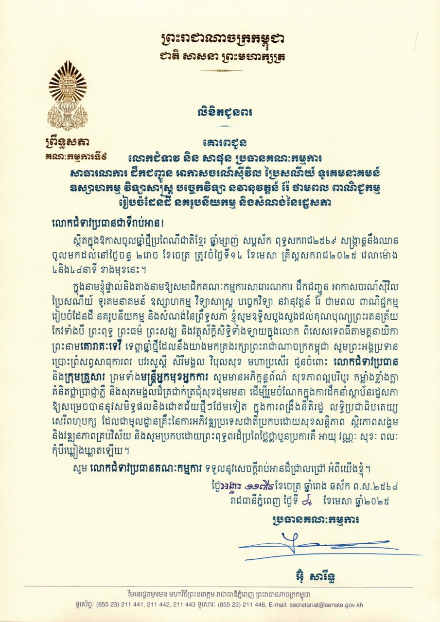 លិខិតជូនពររបស់គណៈកម្មការសាធារណការទី៩ ព្រឹទ្ធសភា ជូនពរក្នុងឱកាសចូលឆ្នាំថ្មីប្រពៃណីជាតិខ្មែរ ឆ្នាំម្សាញ់ សប្តស័ក ព.ស.២៥៦៩ សូមគោរពជូន លោកជំទាវ និន សាផុន ប្រធានគណៈកម្មការសាធារណការ ដឹកជញ្ជូន អាកាសចរណ៍ស៊ីវិល ប្រៃសណីយ៍ ទូរគមនាគមន៍ ឧស្សាហកម្ម វិទ្យាសាស្ត្រ បច្ចេកវិទ្យា នវានុវត្តន៍ រ៉ែ ថាមពល ពាណិជ្ជកម្ម រៀបចំដែនដី នគរូបនីយកម្ម និងសំណង់នៃរដ្ឋសភា