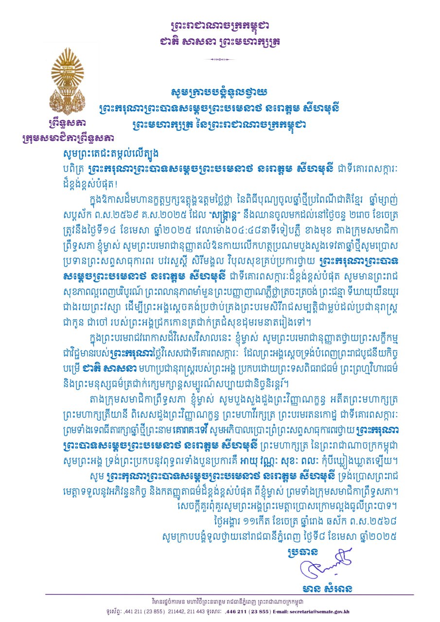 • សារលិខិតថ្វាយព្រះពរ របស់ ក្រុមសមាជិកាព្រឹទ្ធសភា សូមក្រាបបង្គំទូលថ្វាយ ព្រះករុណាព្រះបាទសម្តេច ព្រះបរមនាថ នរោត្តម សីហមុនី ព្រះមហាក្សត្រ នៃព្រះរាជាណាចក្រកម្ពុជា